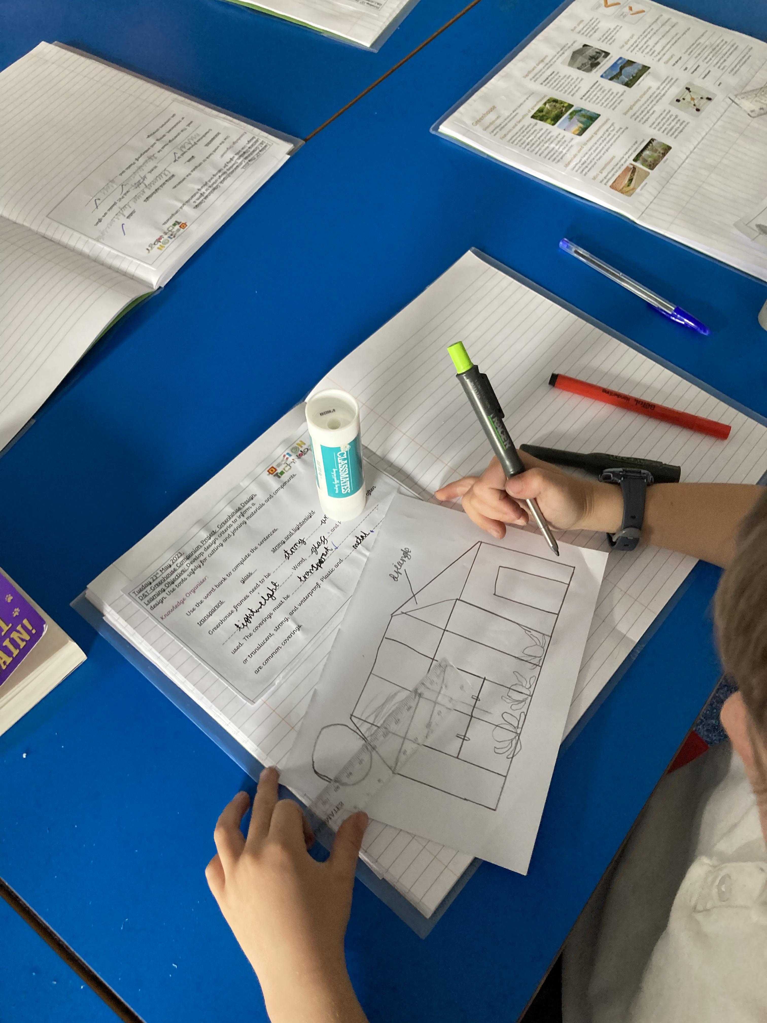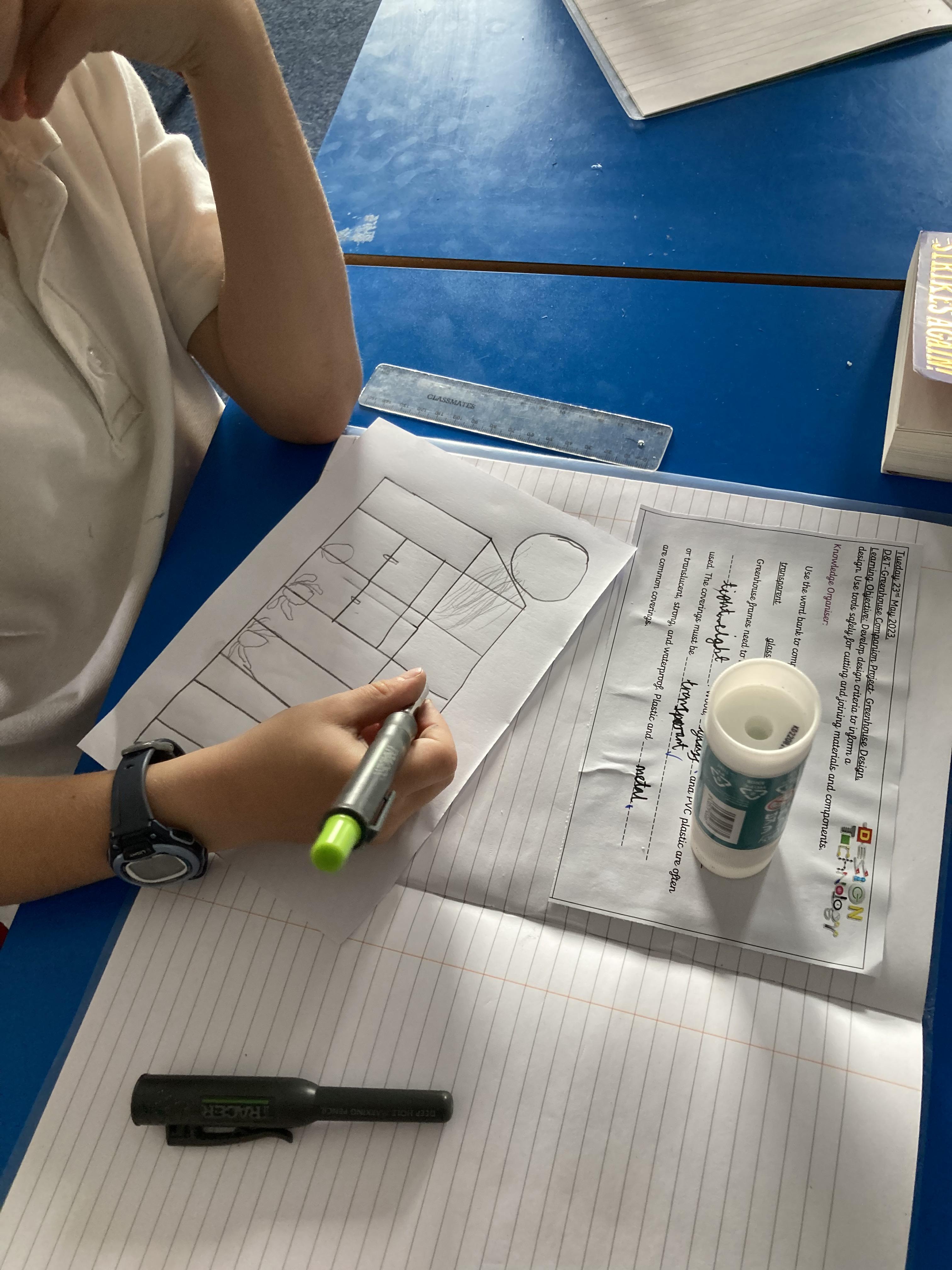 After testing materials and creating joints last week, Class 2 began designing their greenhouses. Paying careful attention to the materials they would use and the requirements needed for a successful environment, the children worked collaboratively in groups to plan, sketch and label their designs. They then tested the equipment they would use to cut and join the materials needed.