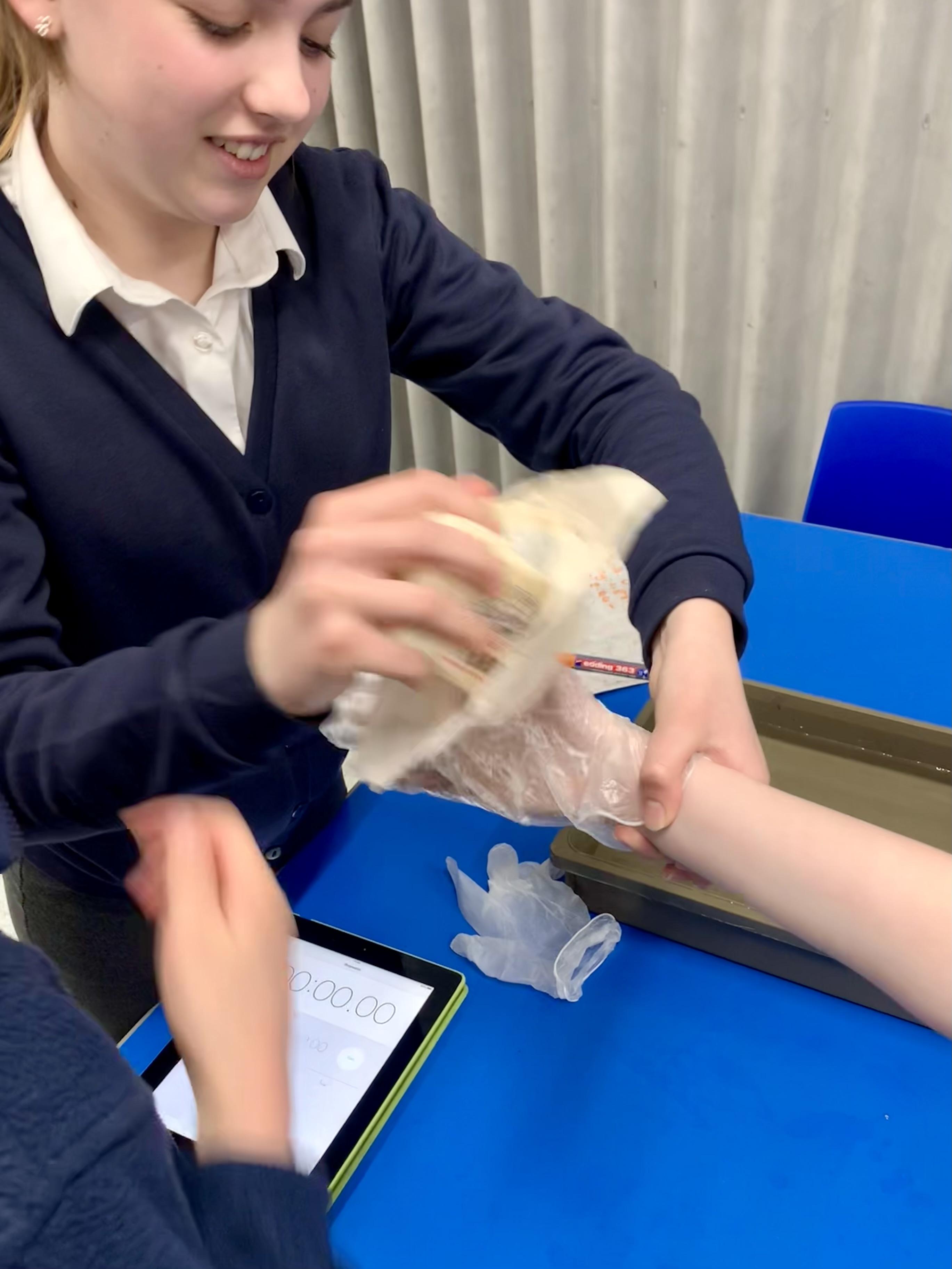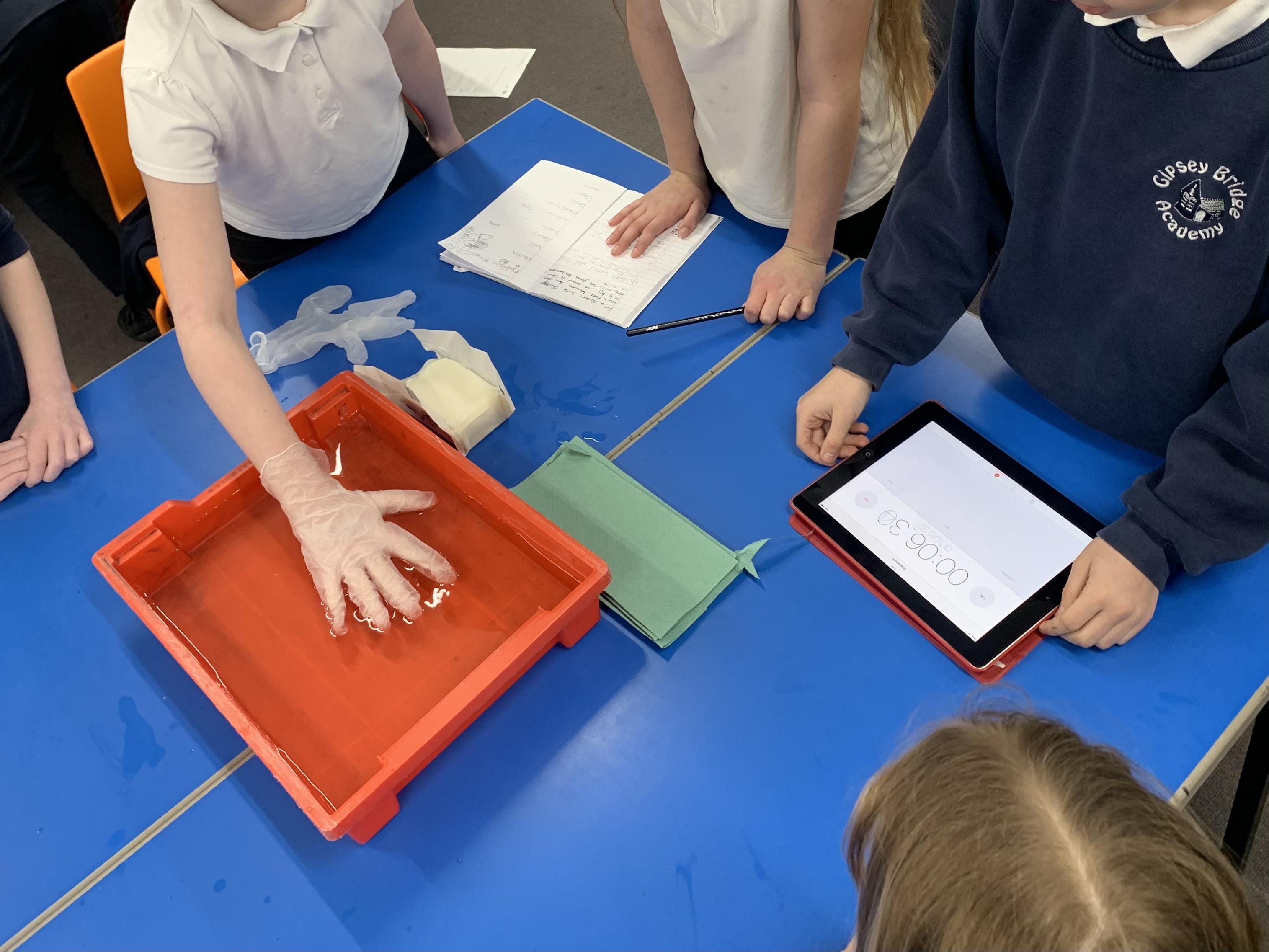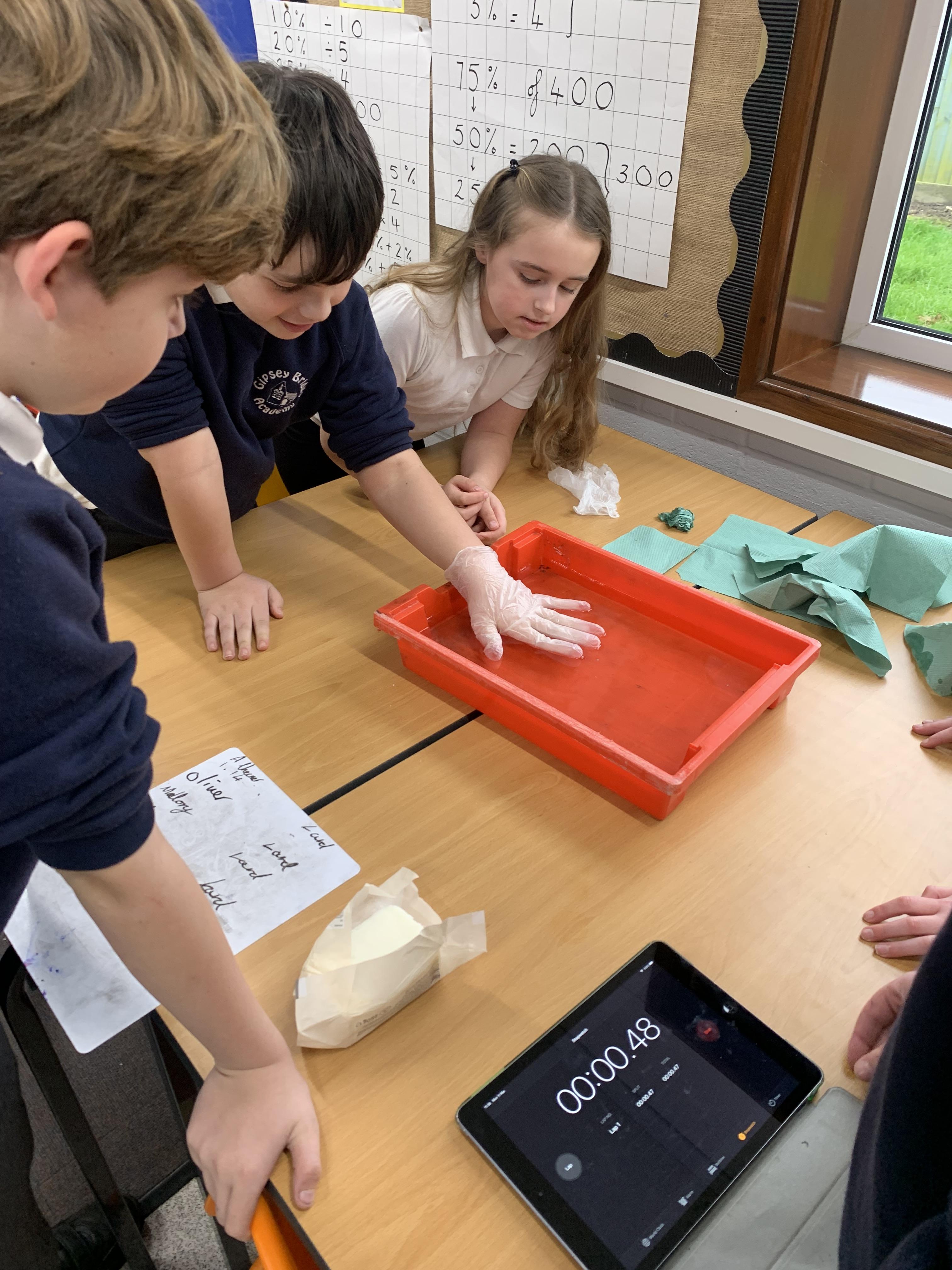 Today, we investigated blubber under the skin as a polar adaptation. As part of our research last week, we found that some polar animals have blubber under their skin to prevent their internal organs from getting too cold in the water/ice of the polar regions. Today we found out how that worked! We used vinyl gloves and lard to compare how long it took to feel cold water with and without a layer of blubber beneath the skin.