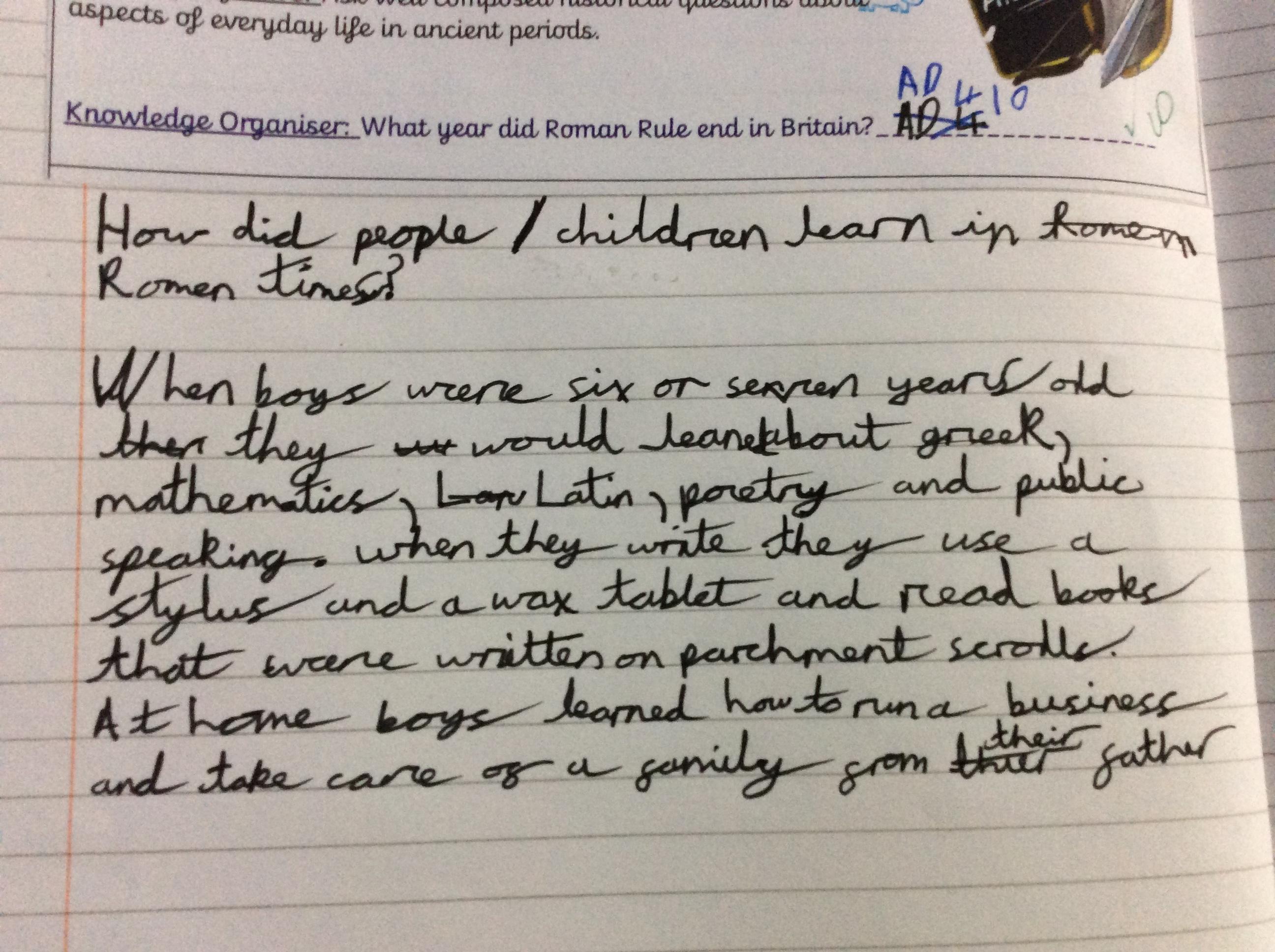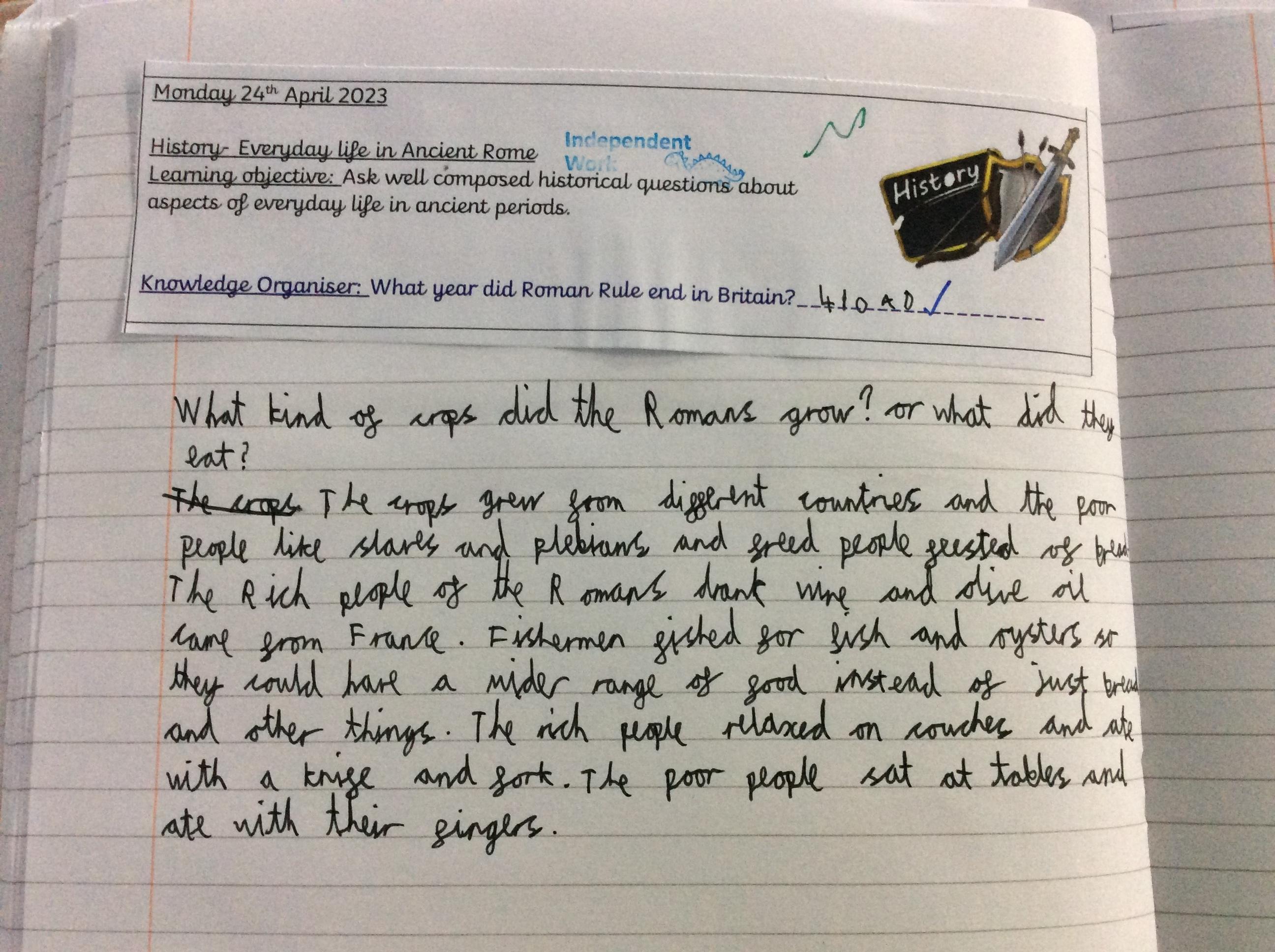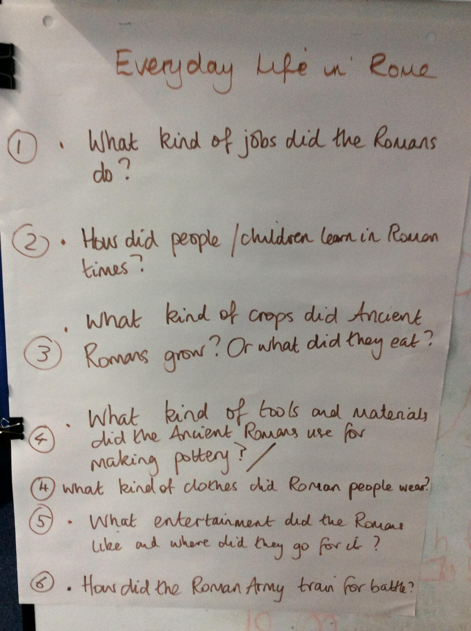 Class 2 were given the task of finding out about the everyday life of Roman people in Ancient Rome. First of all they had to create enquiry questions, that they wanted to research about. After 5 questions were created then then researched facts to create their own explanation paragraph. This was then shared with the class in a group discussion.