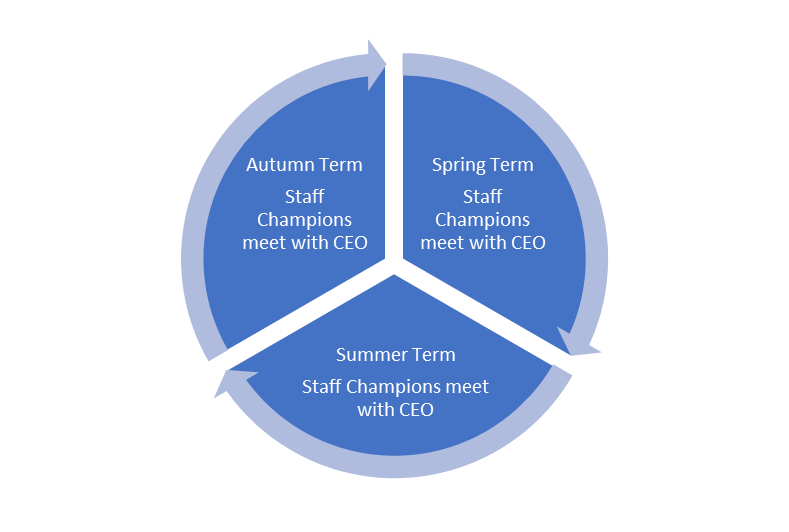 Feedback from staff is crucial in the development of our academies and the Trust. To this end, Infinity work closely with Staff Champions from each academy. Staff Champions meet as a group with the CEO at three points during the year. They have the opportunity to reflect on key areas including: