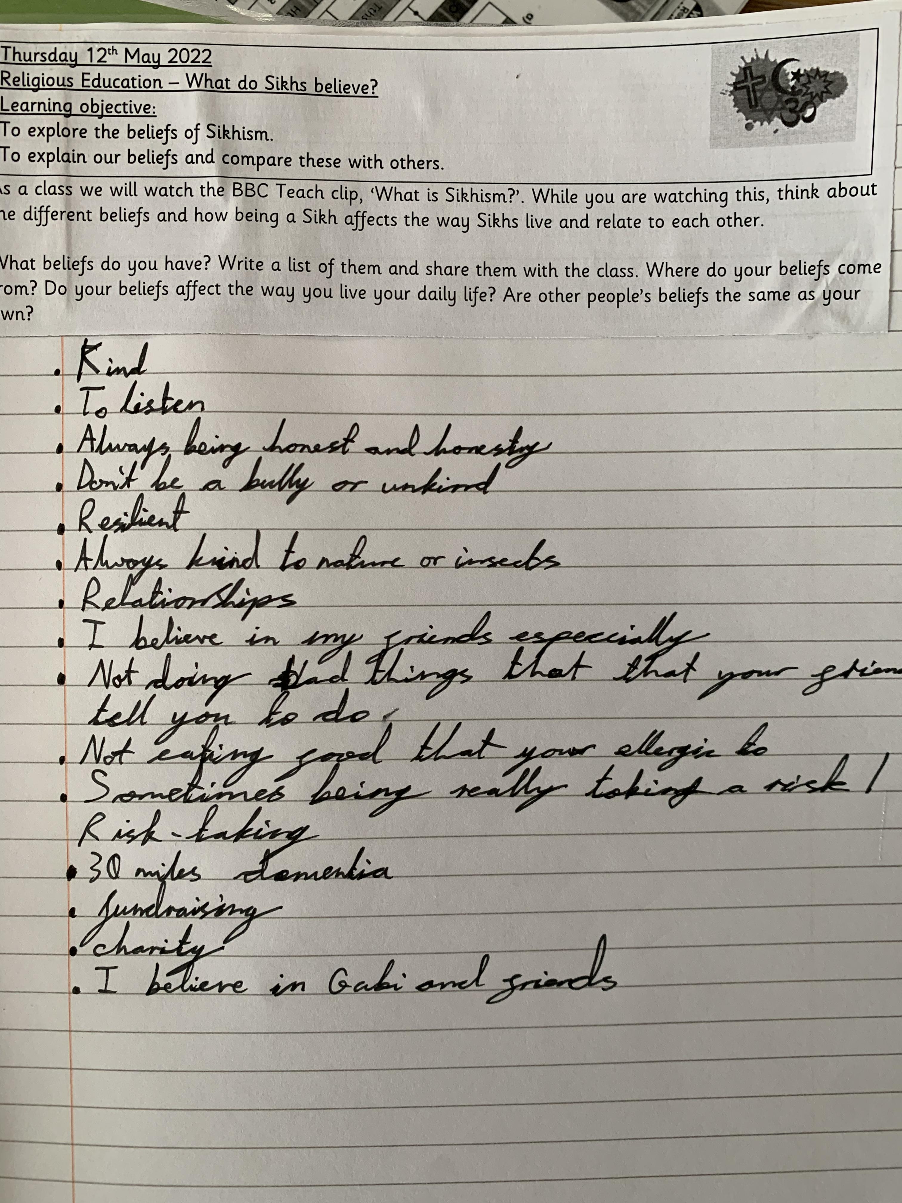 This week, we watched a clip about the different beliefs of people following Sikhism. This prompted a very interesting discussion about our own beliefs. It was amazing to hear how important charity and fundraising is to some of us. As a class we decided that we should always try and do our best for people who are less fortunate than ourselves.