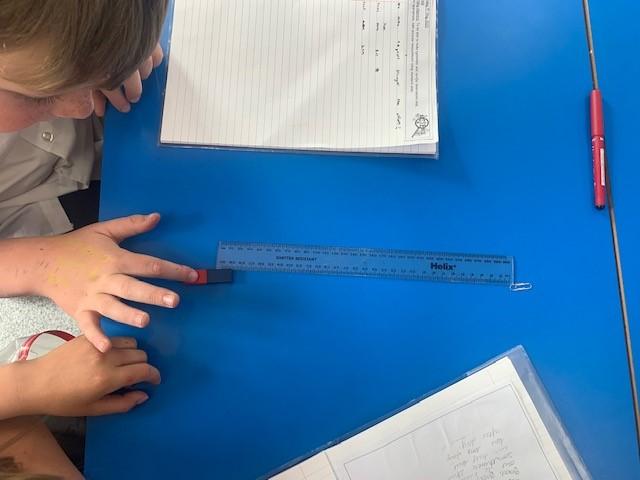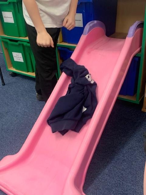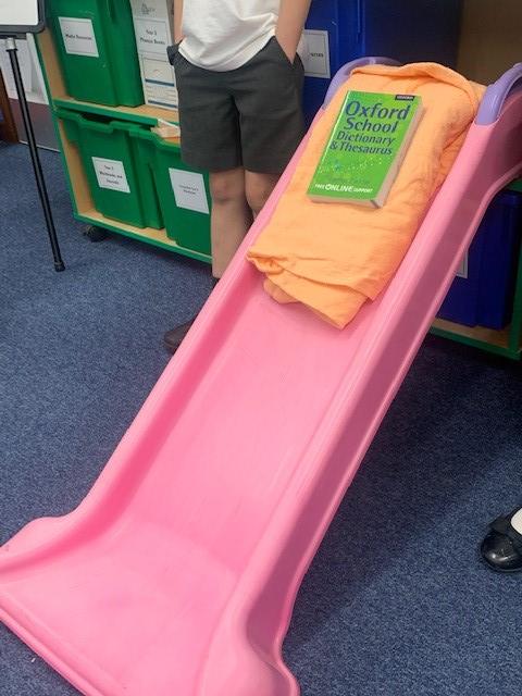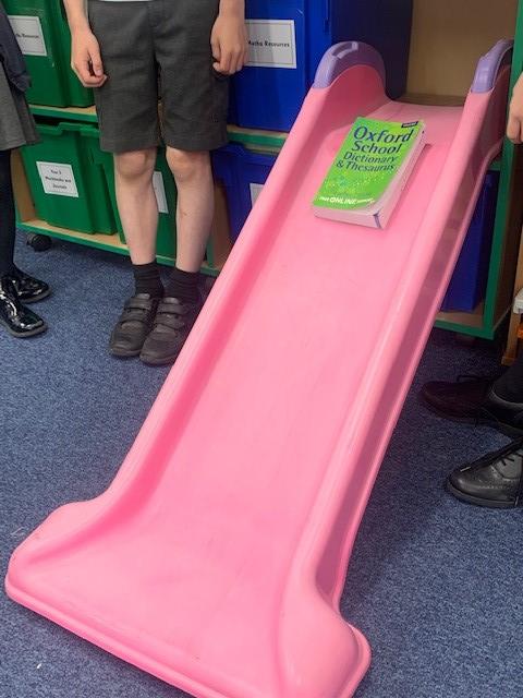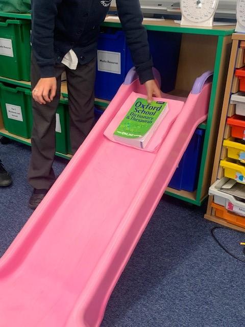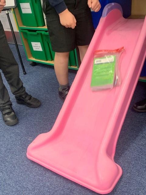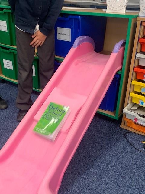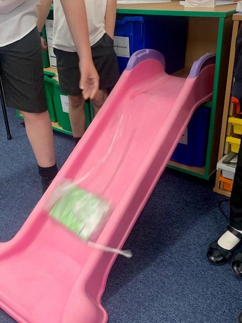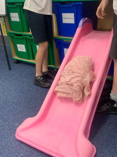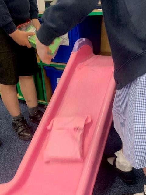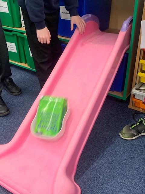 Today, we carried out an investigation into the effect different materials had on the friction between a slide and a book. We were surprised to find that the felt decreased the friction and the cling film increased the friction! Our other predictions were correct; we talked about the properties of the materials to explain why we thought the friction would be increased or decreased.