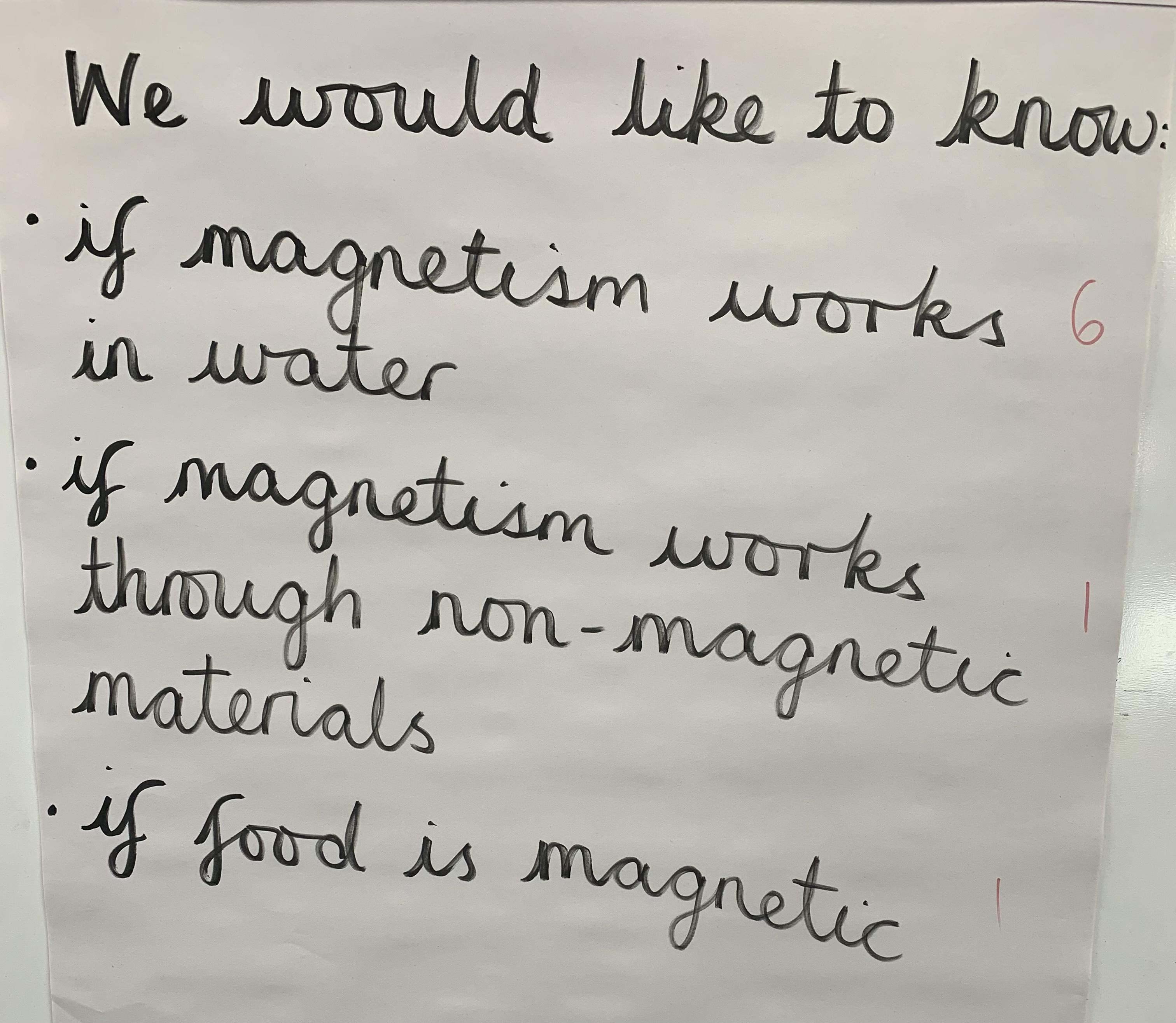 On Wednesday, we got to choose our own investigations! We were asked what we wanted to know about magnetism, before planning and carrying our own investigations. We found that magnetism really does work under water, food is not magnetic and magnets can still attract through non-magnetic items, even the table!