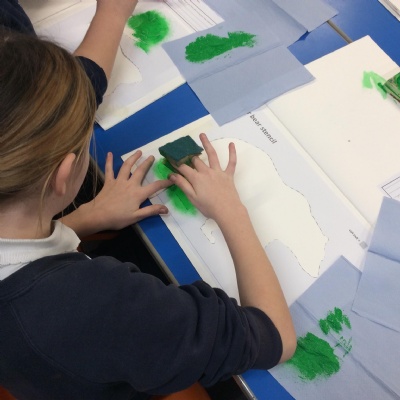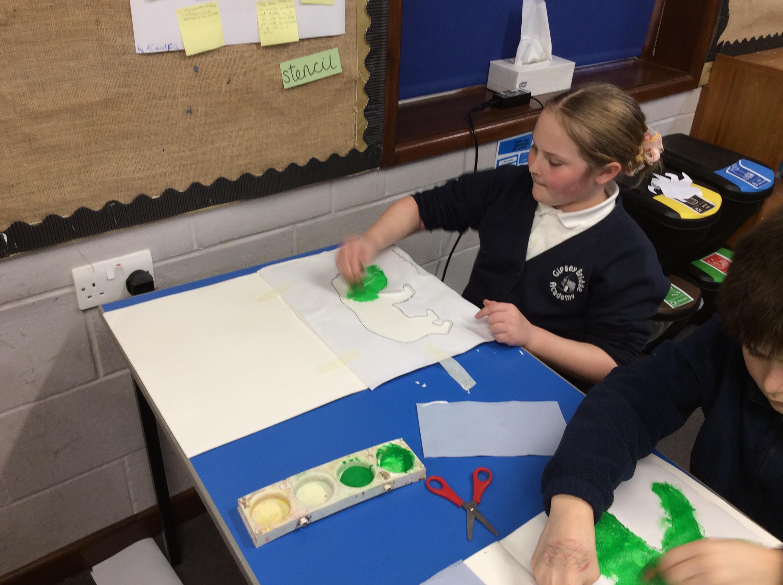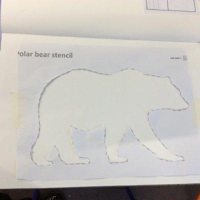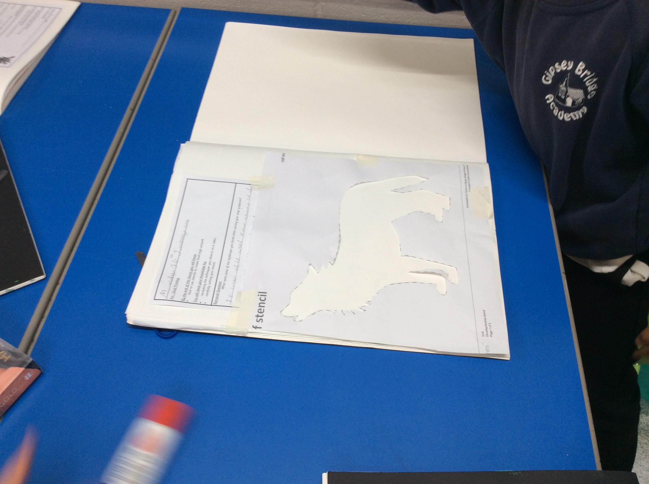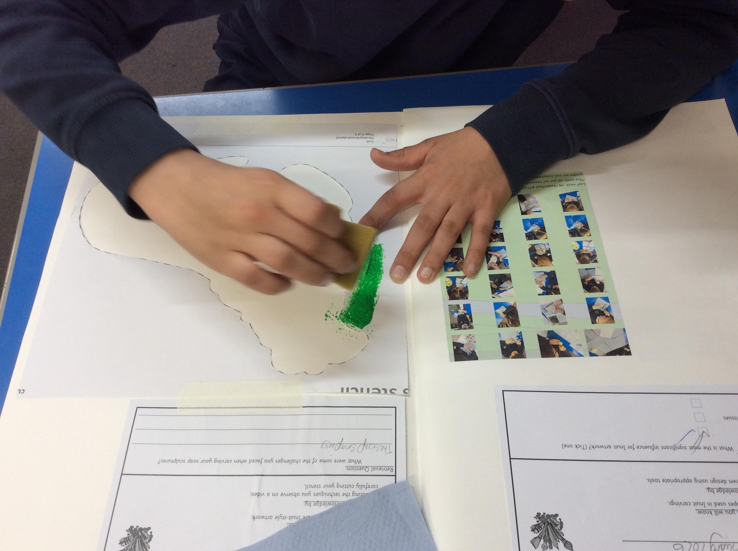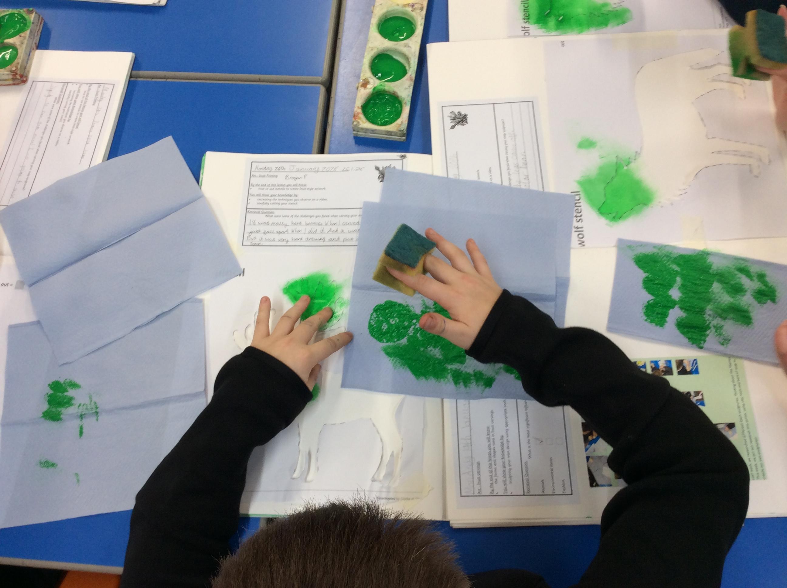 We’ve been exploring stencilling this week! We prepared our stencils by carefully cutting them out. We then taped them into our sketch books, ready to paint in the next session.