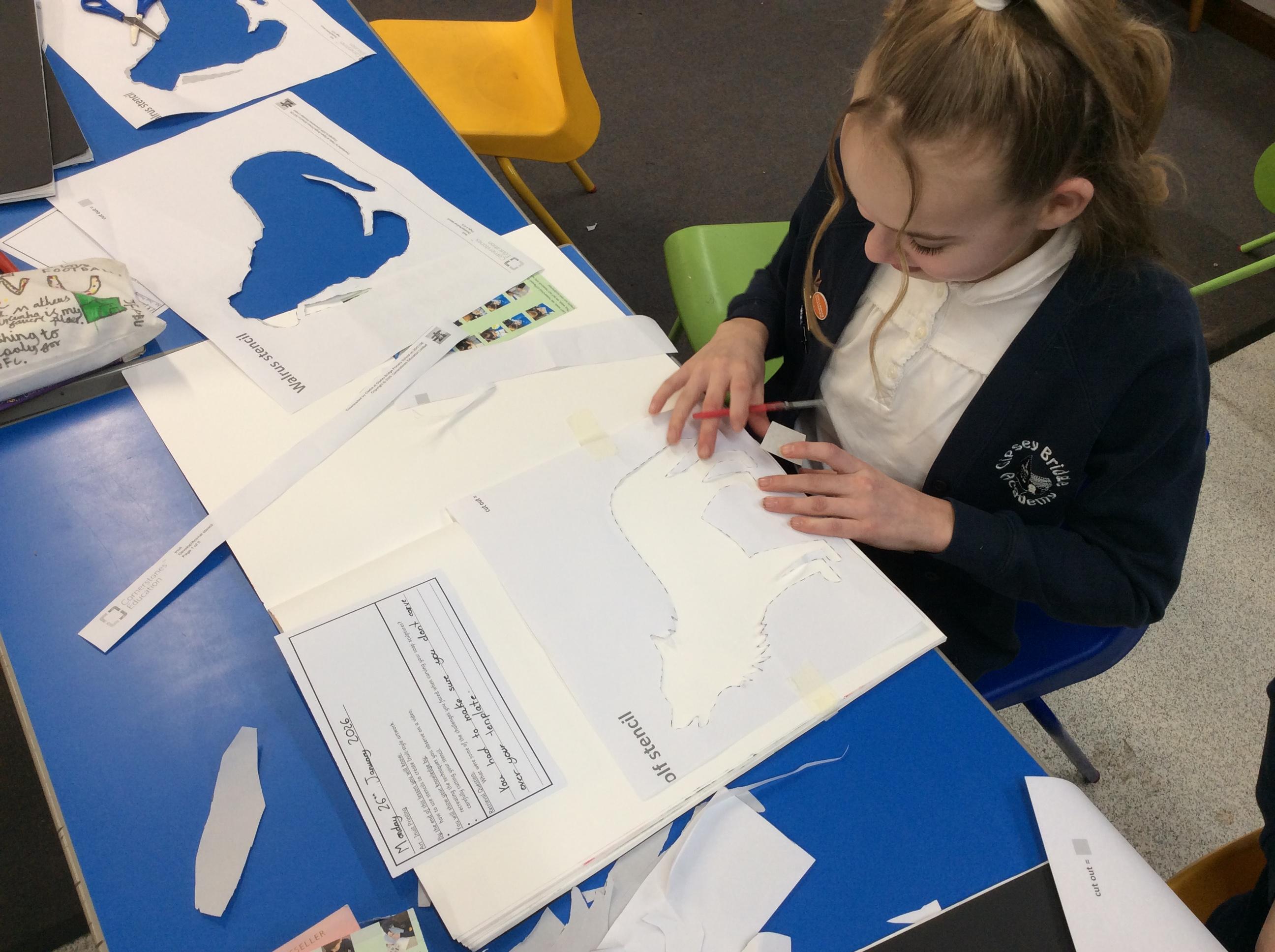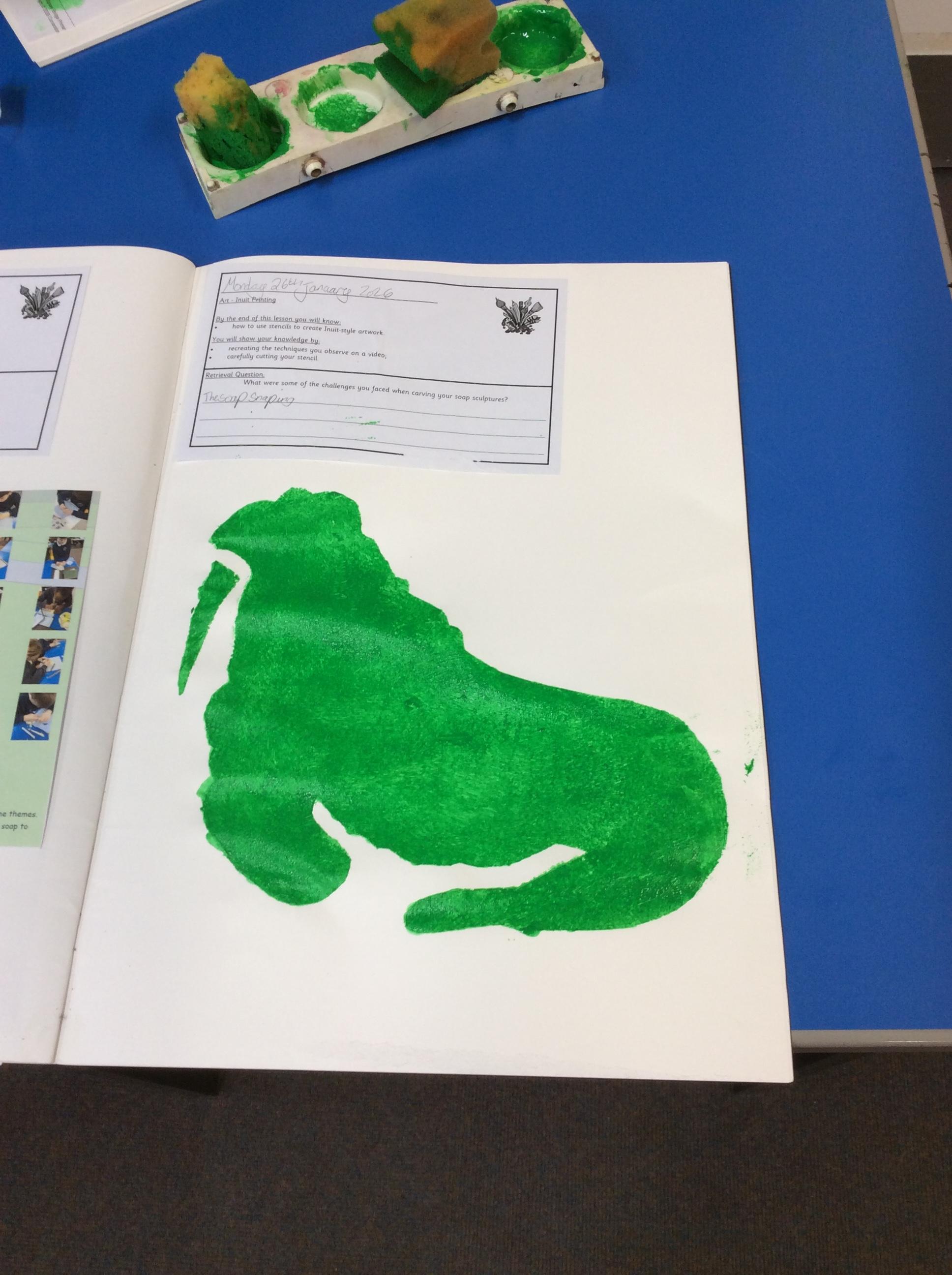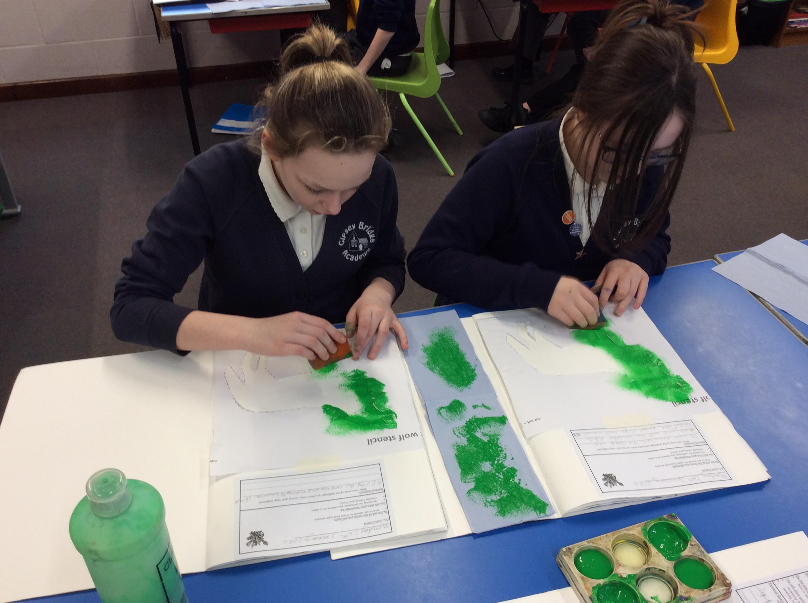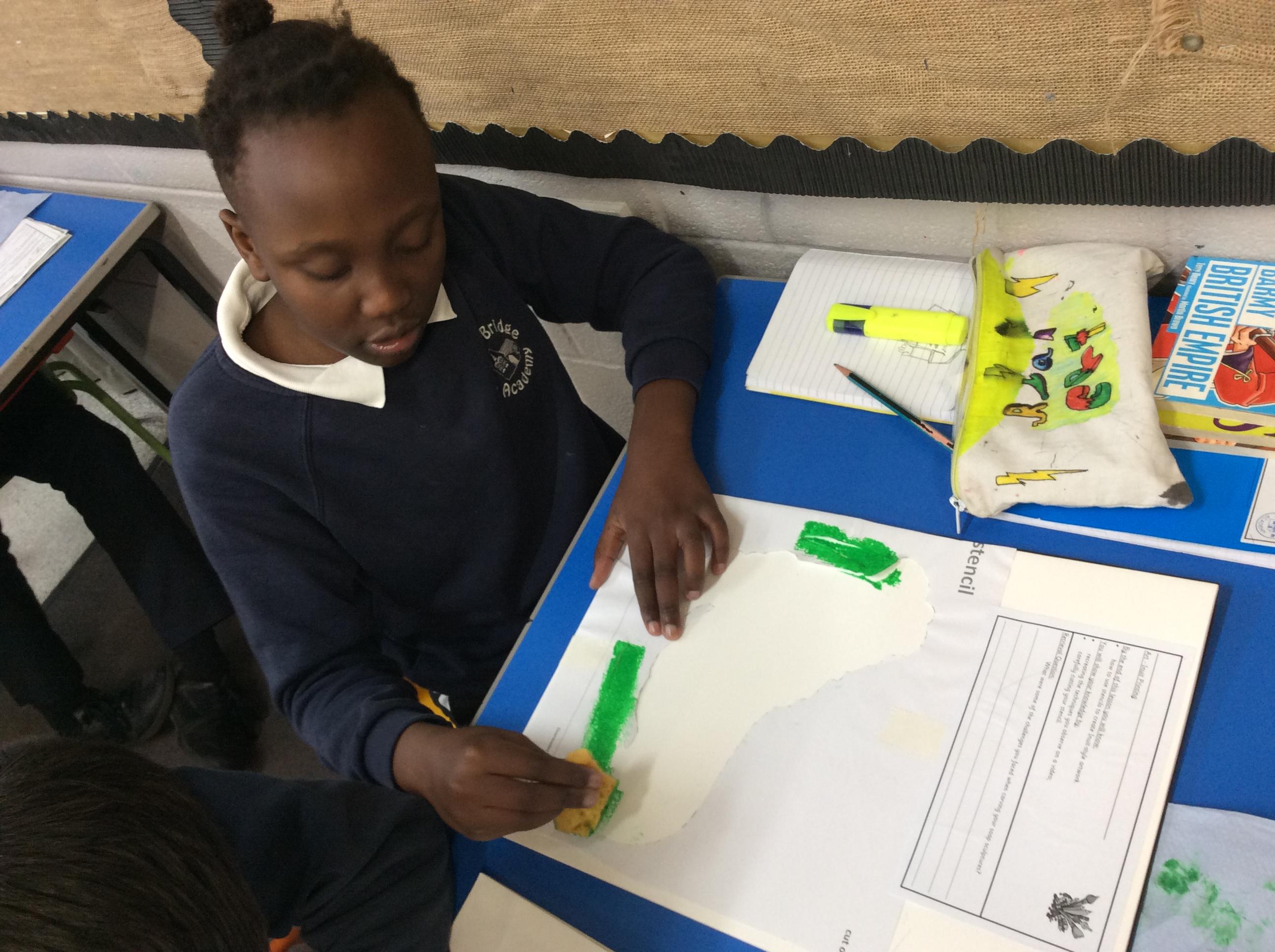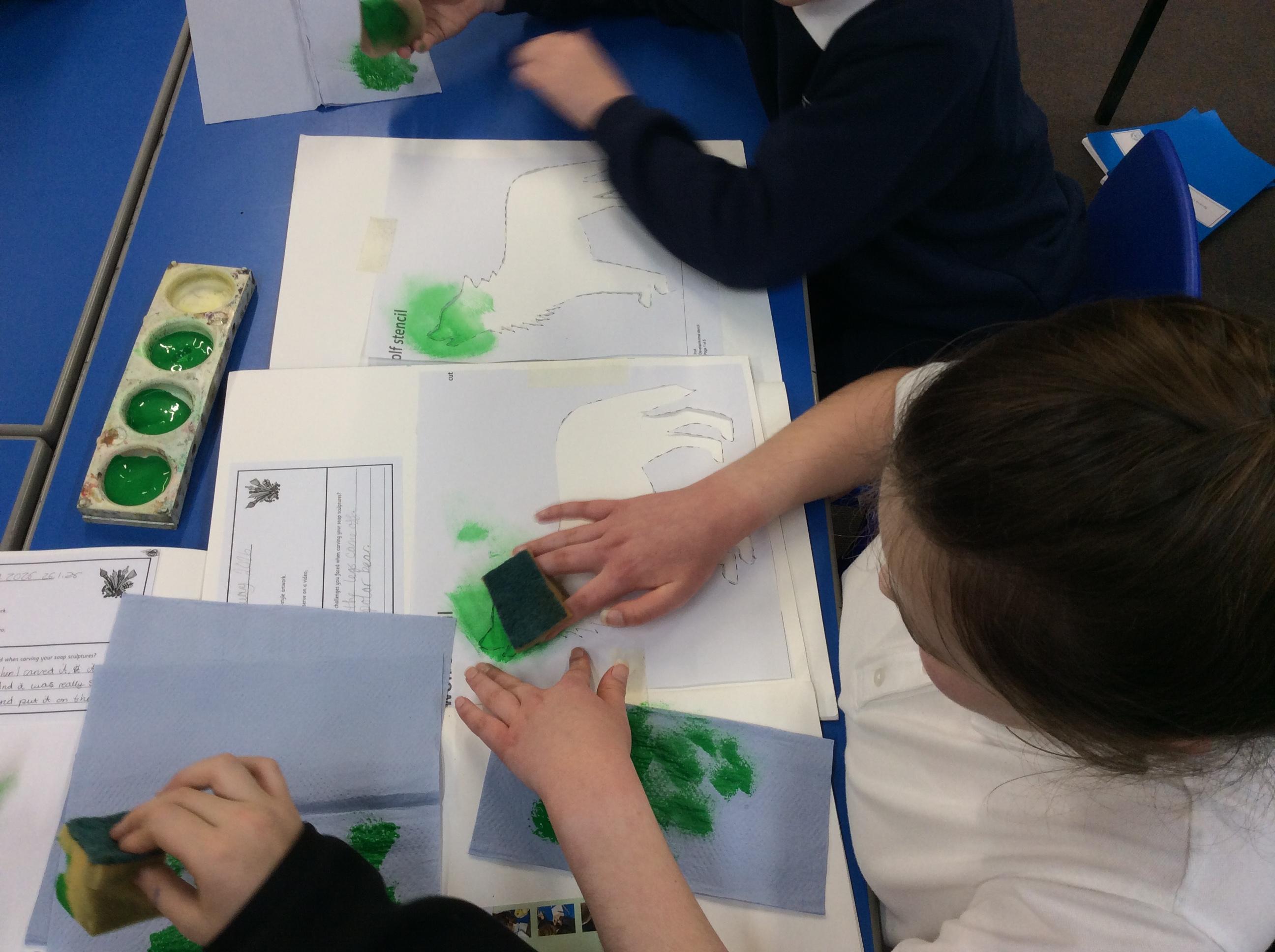 We’ve been exploring stencilling this week! We prepared our stencils by carefully cutting them out. We then taped them into our sketch books, ready to paint in the next session.