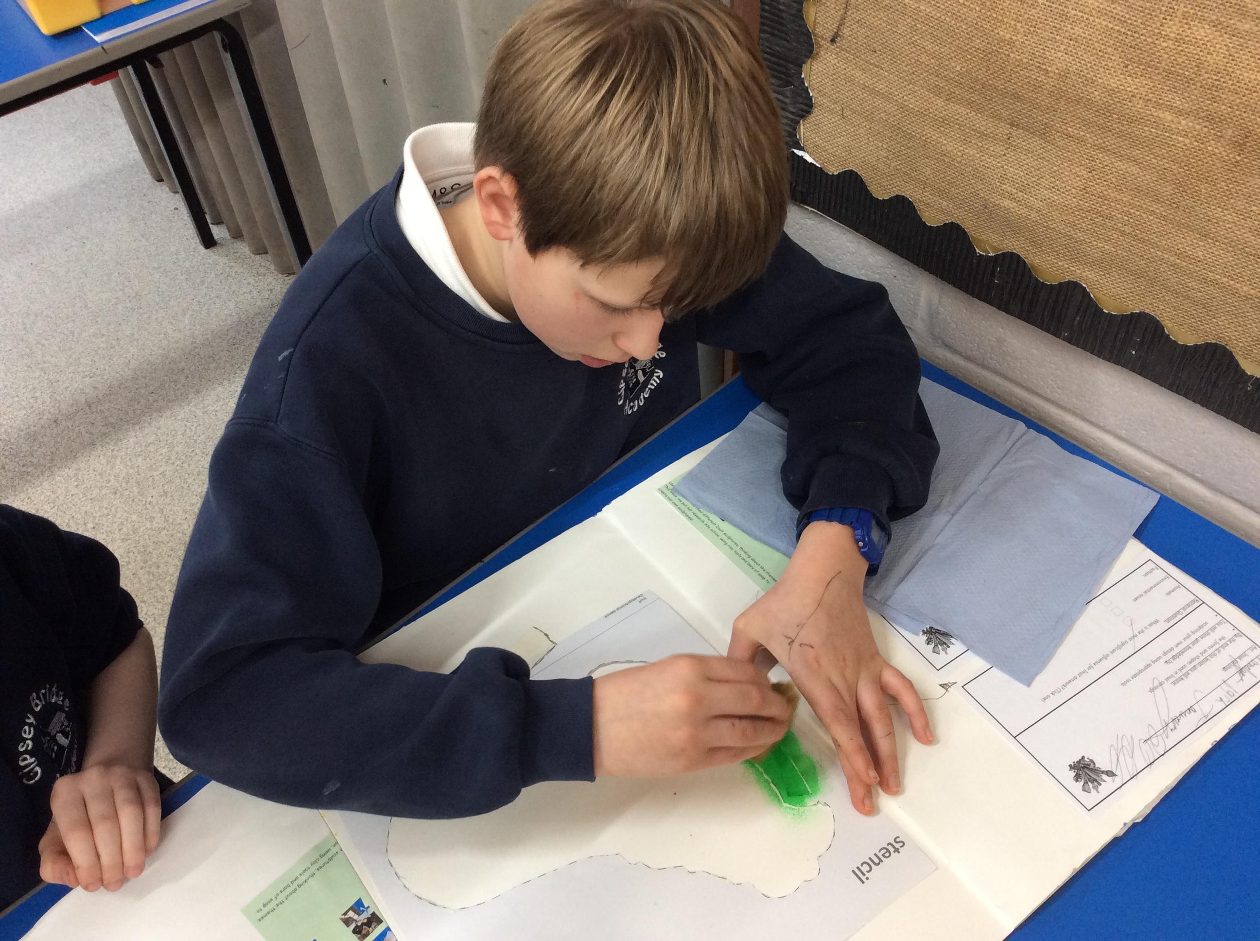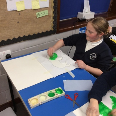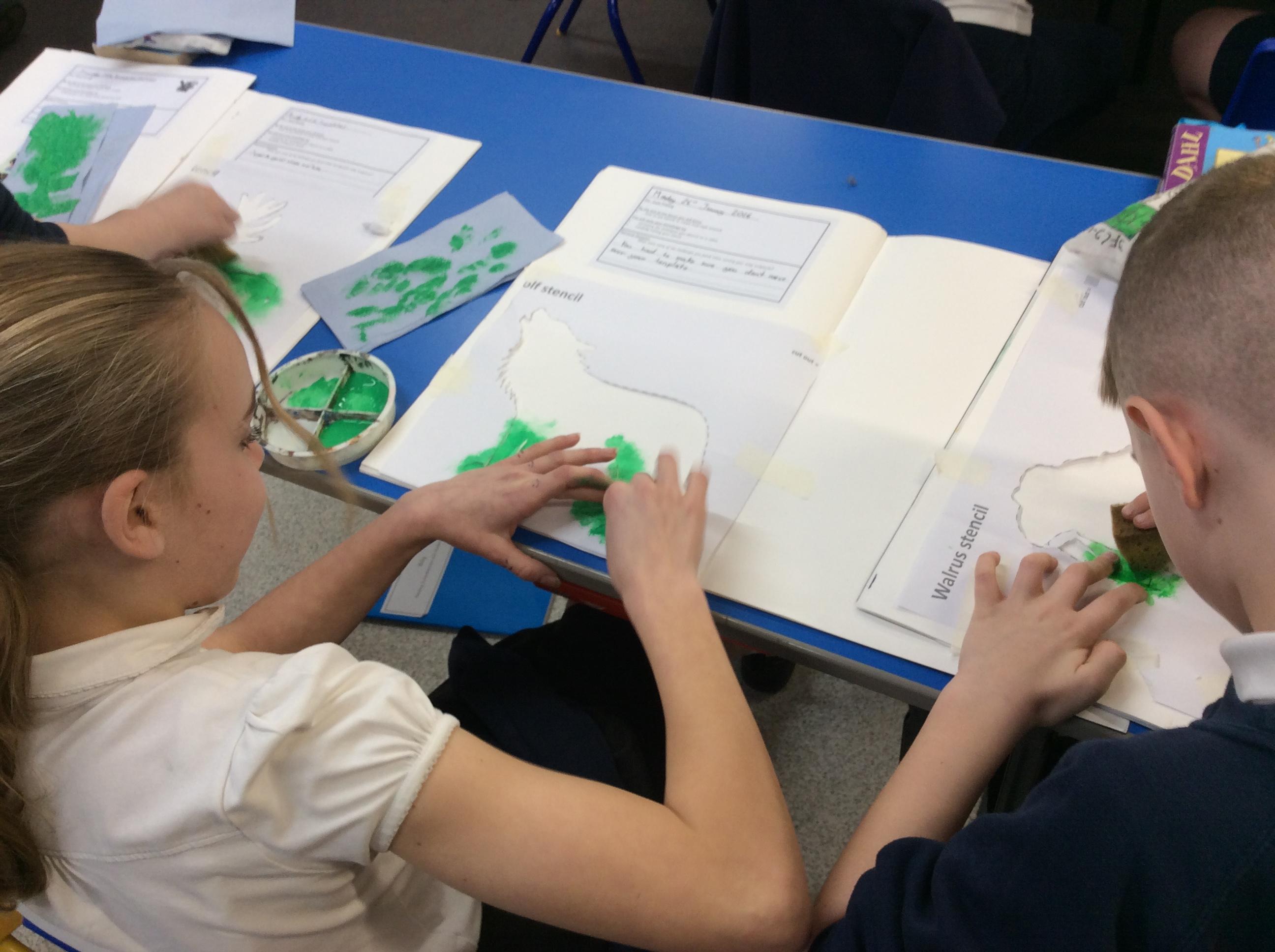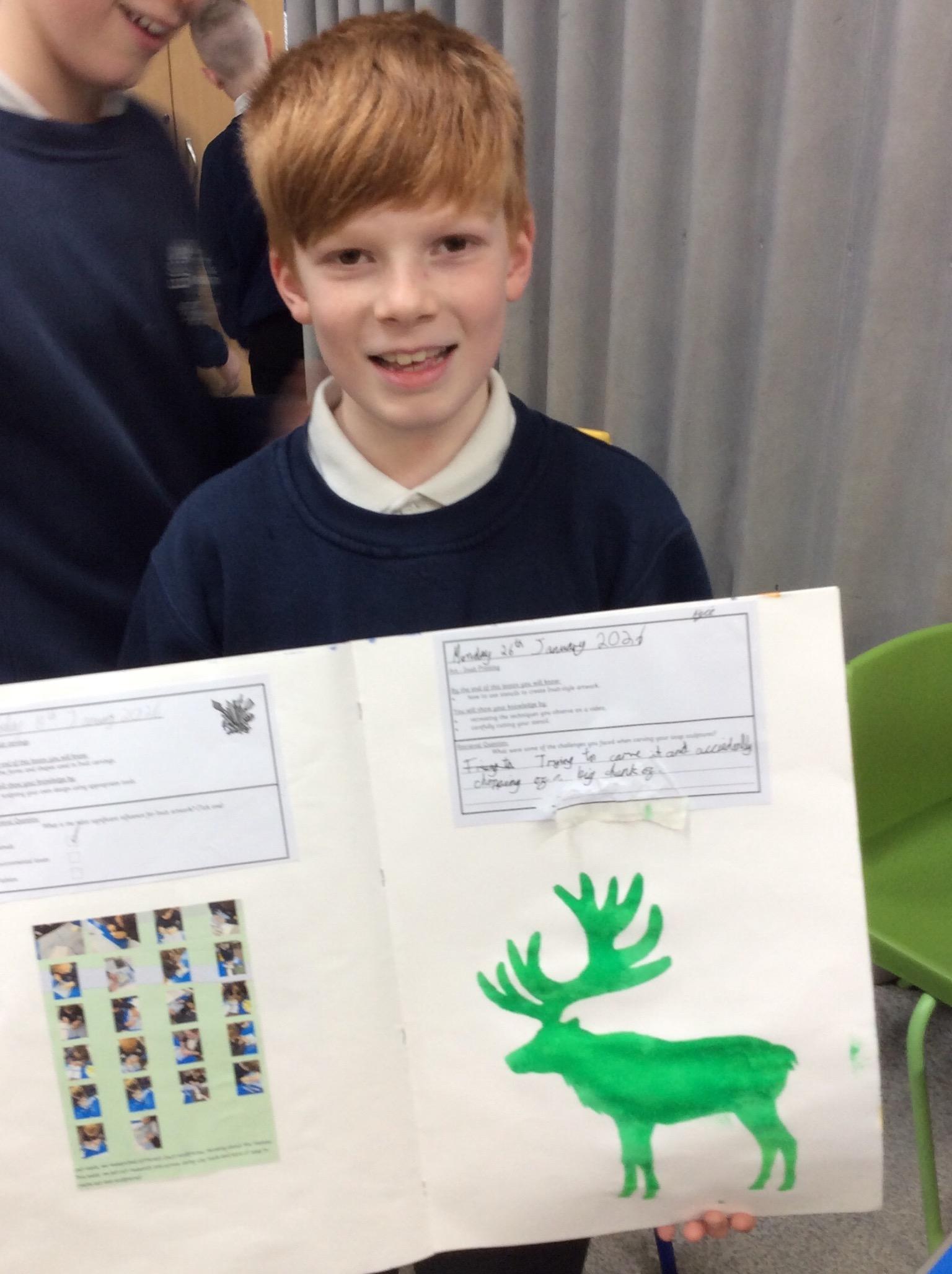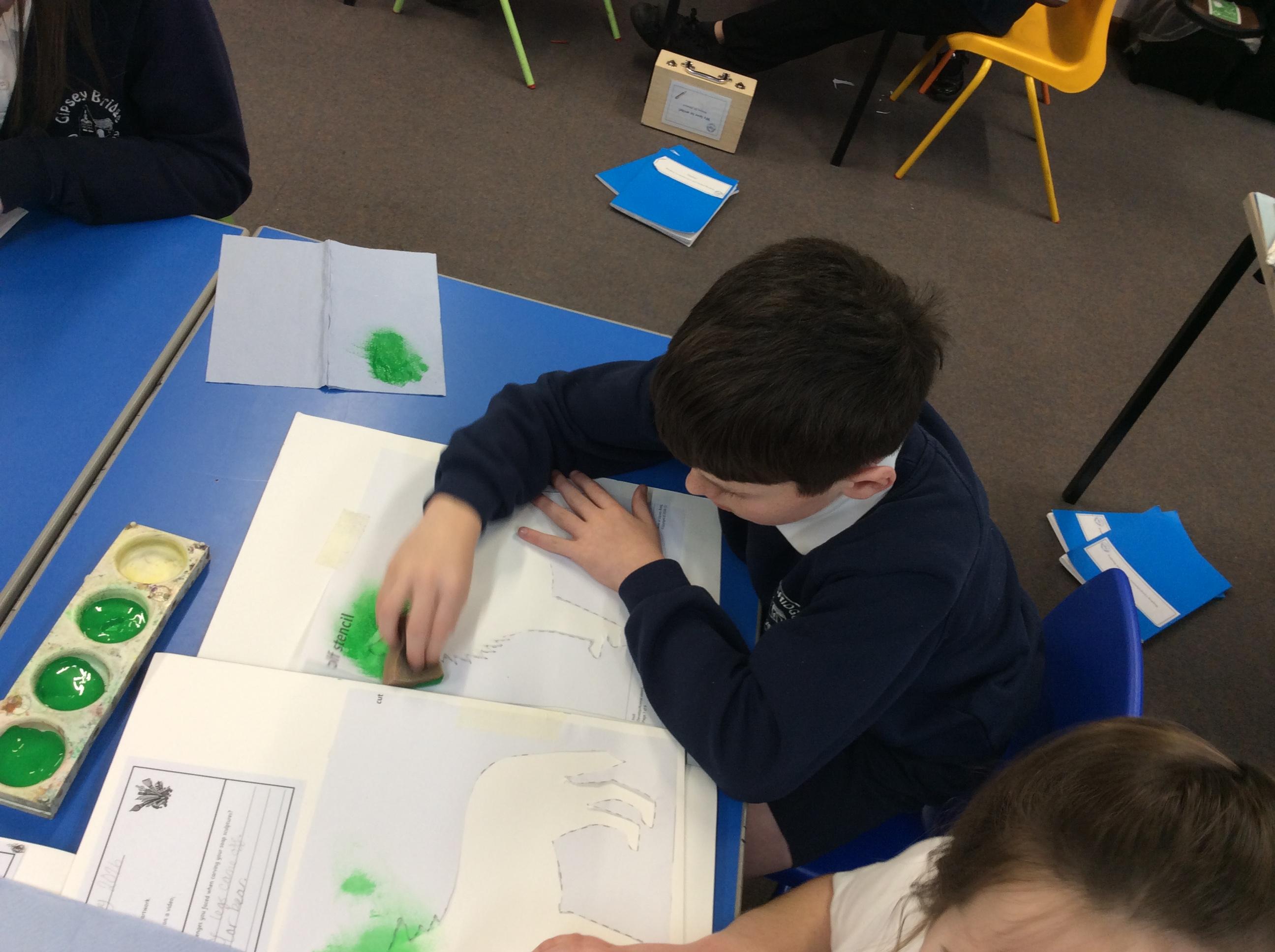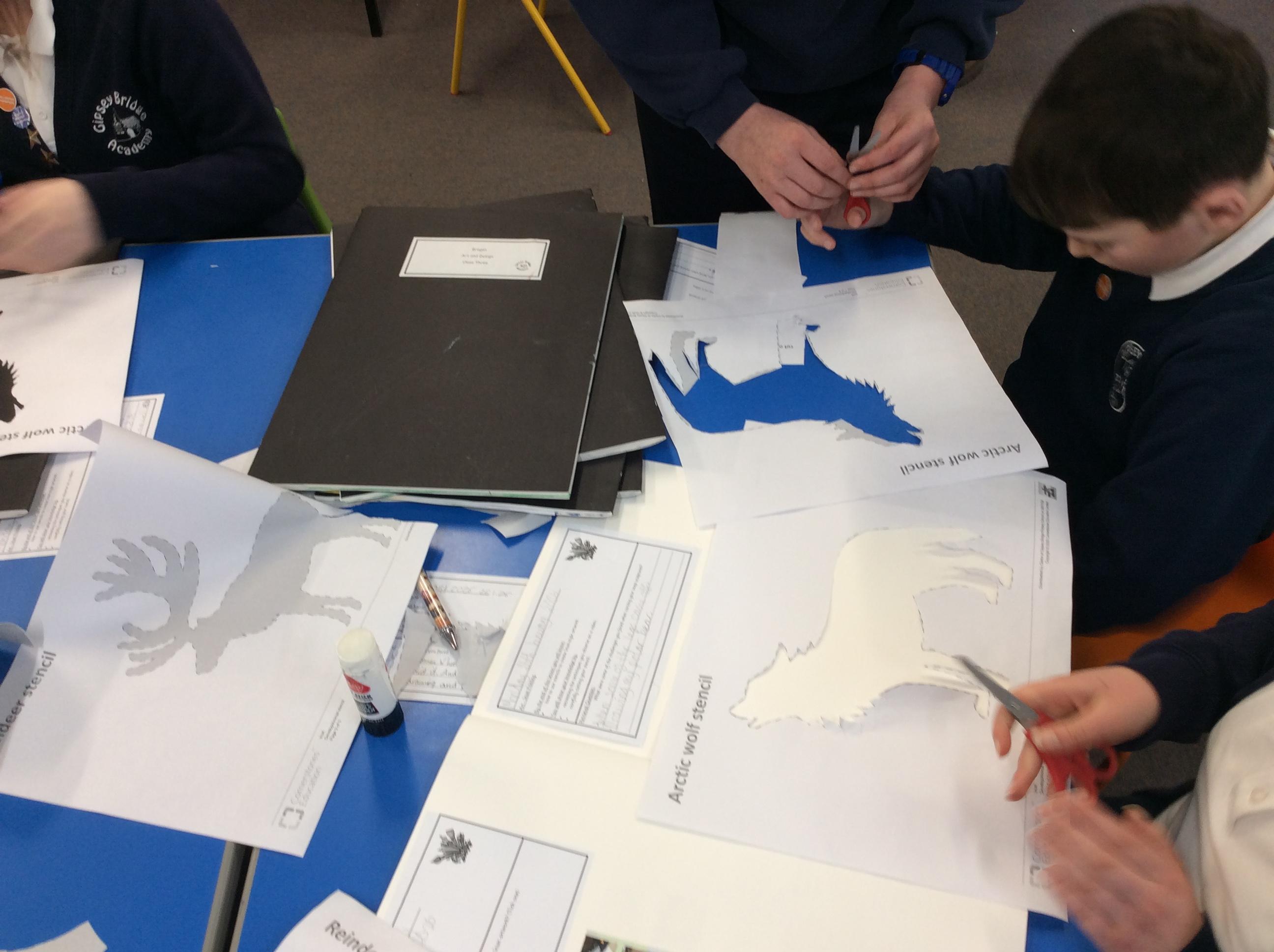 We’ve been exploring stencilling this week! We prepared our stencils by carefully cutting them out. We then taped them into our sketch books, ready to paint in the next session.