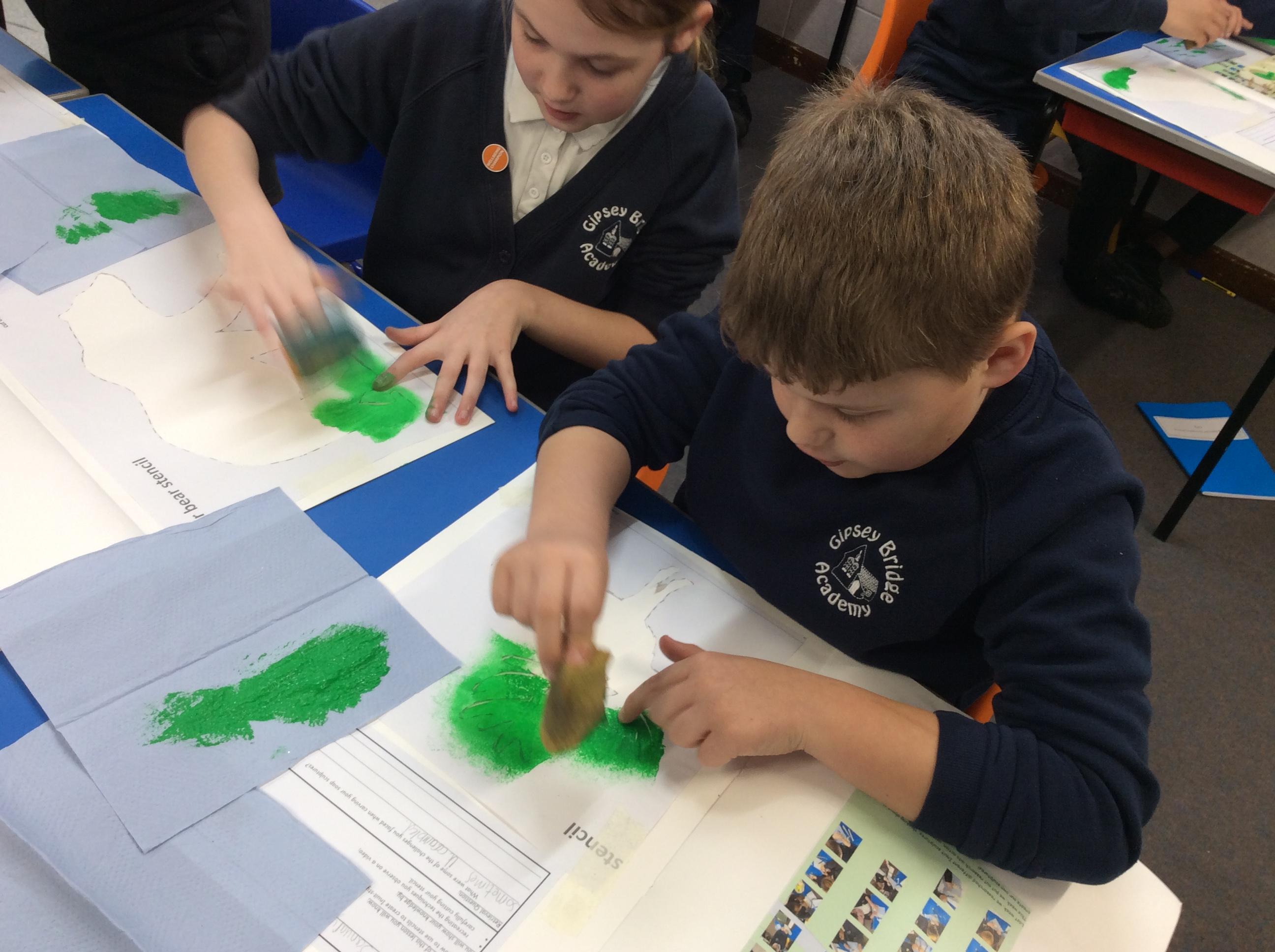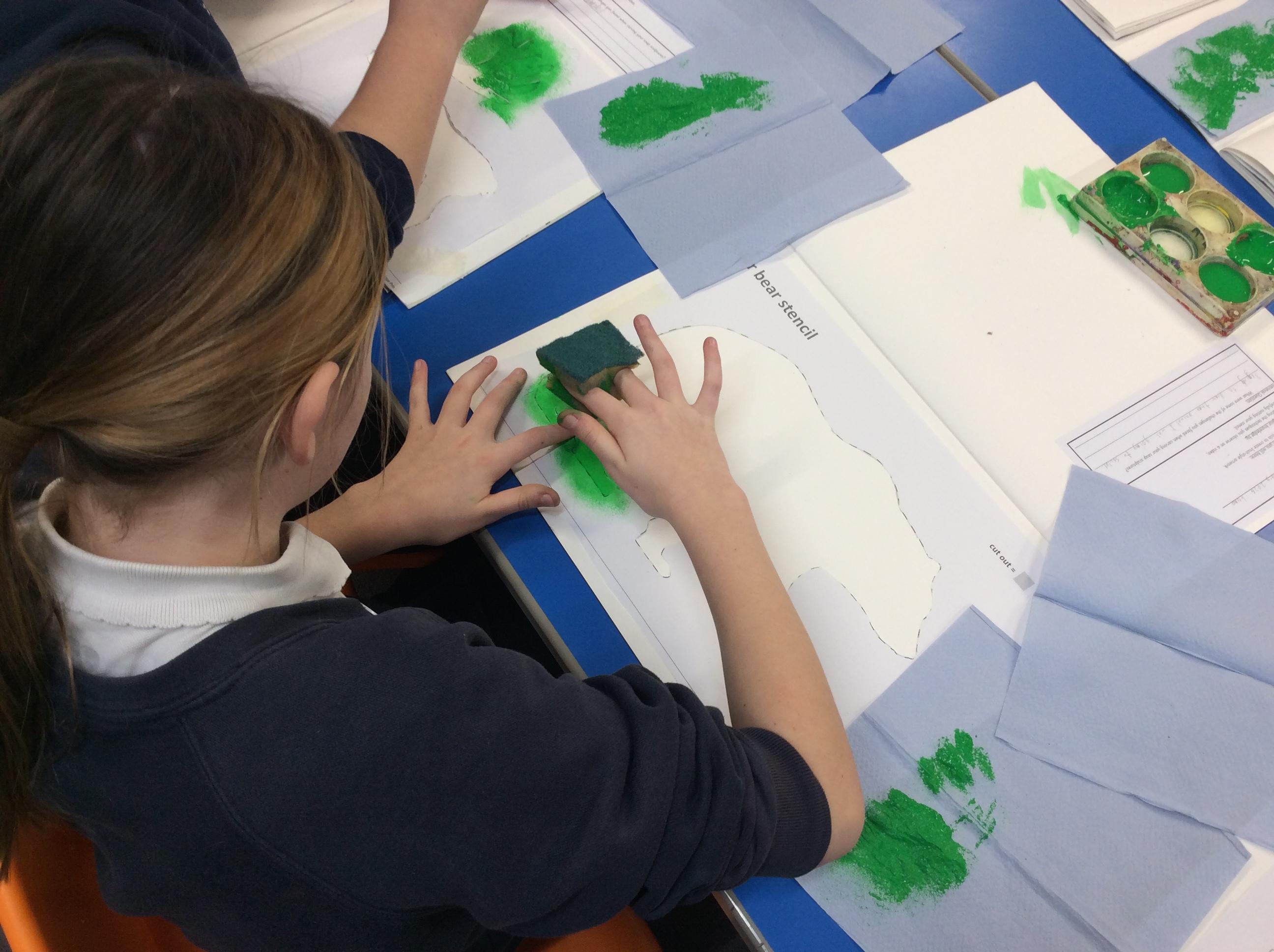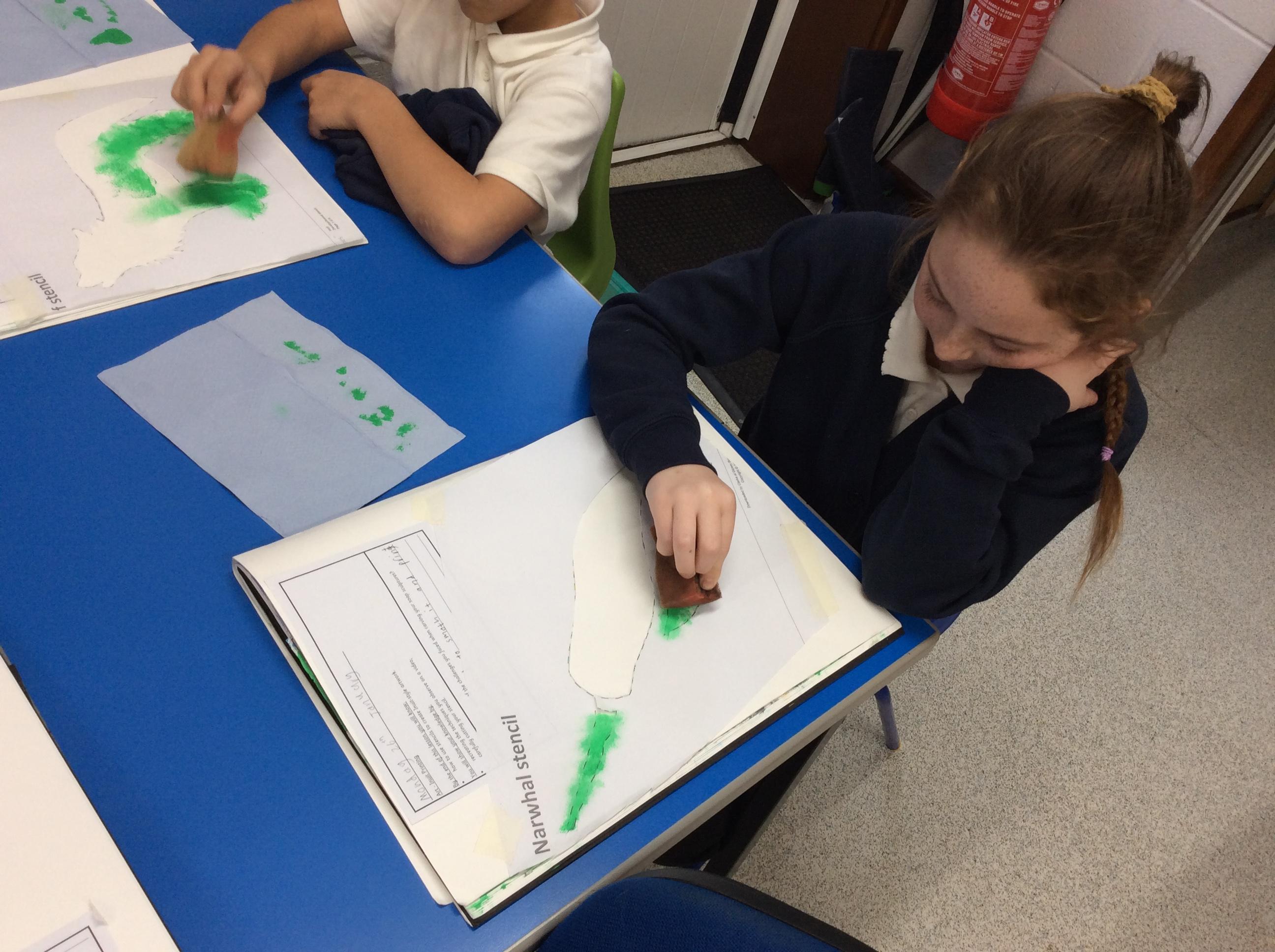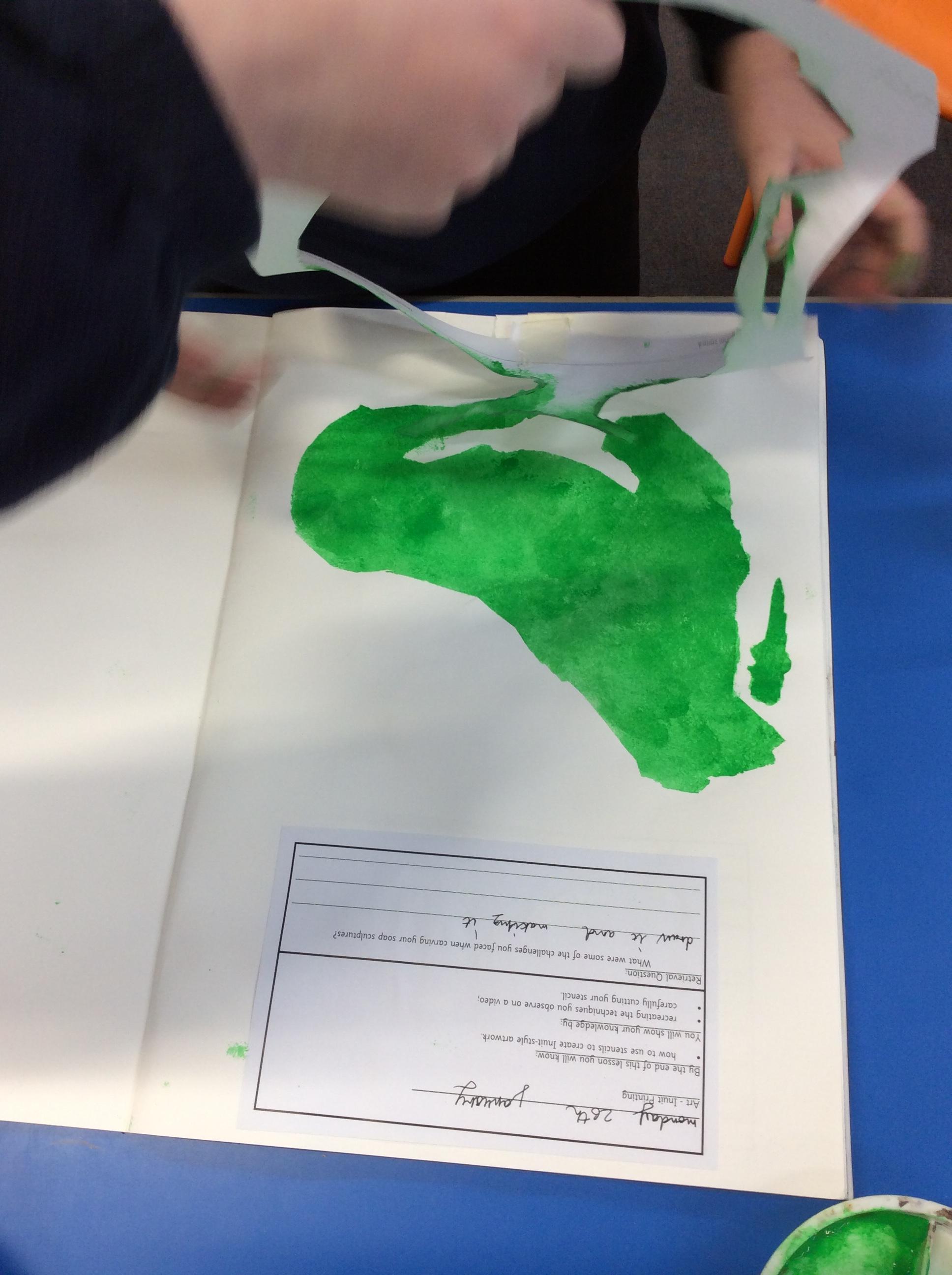 We’ve been exploring stencilling this week! We prepared our stencils by carefully cutting them out. We then taped them into our sketch books, ready to paint in the next session.