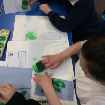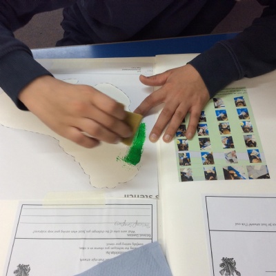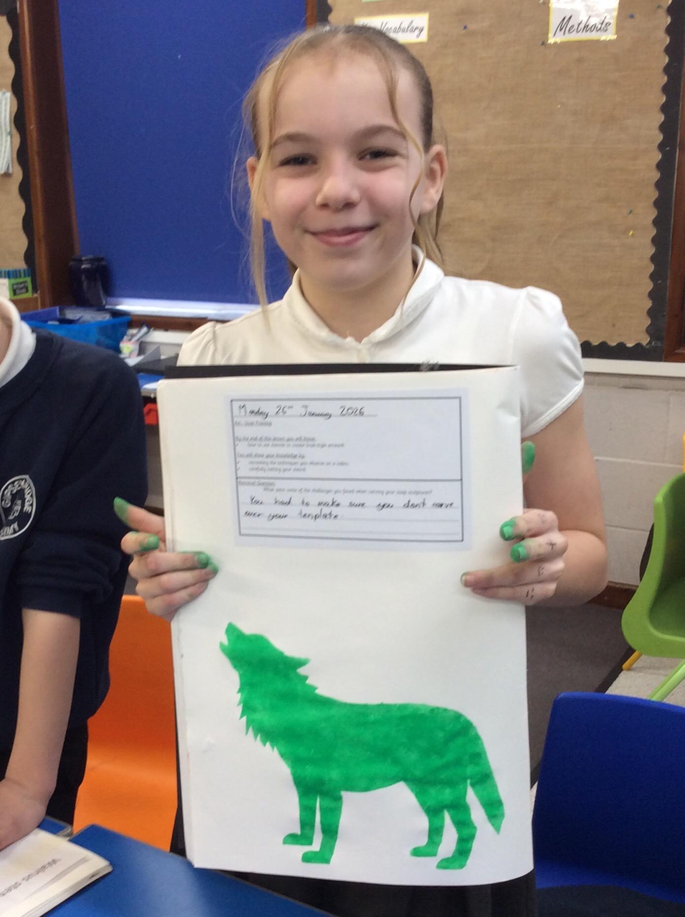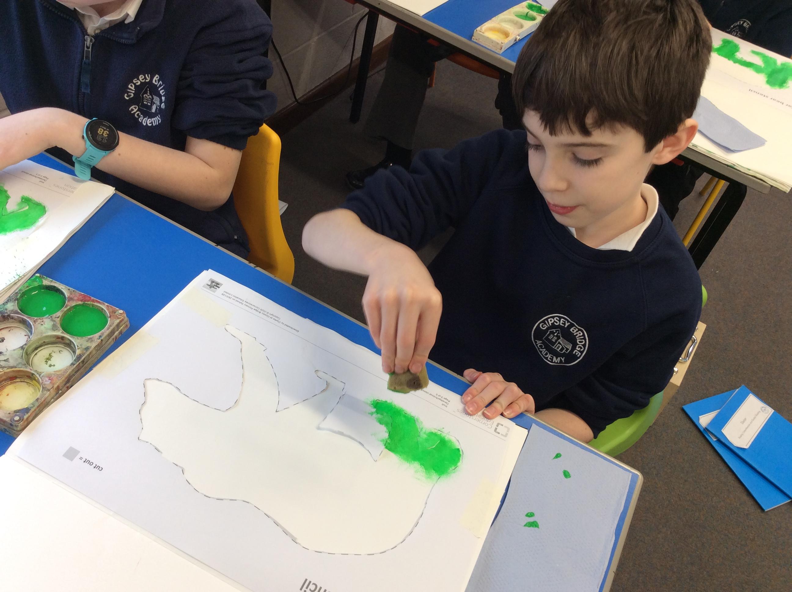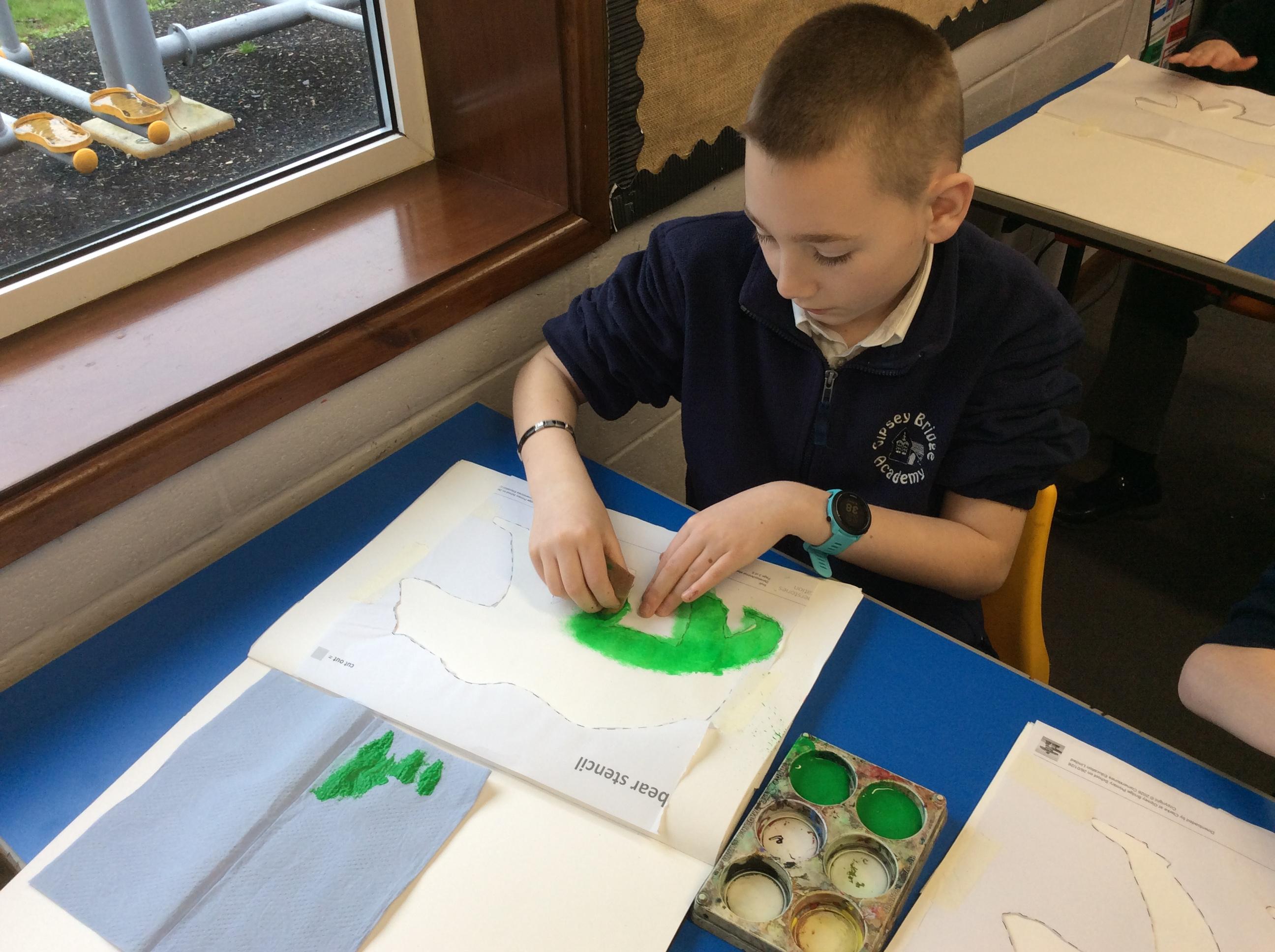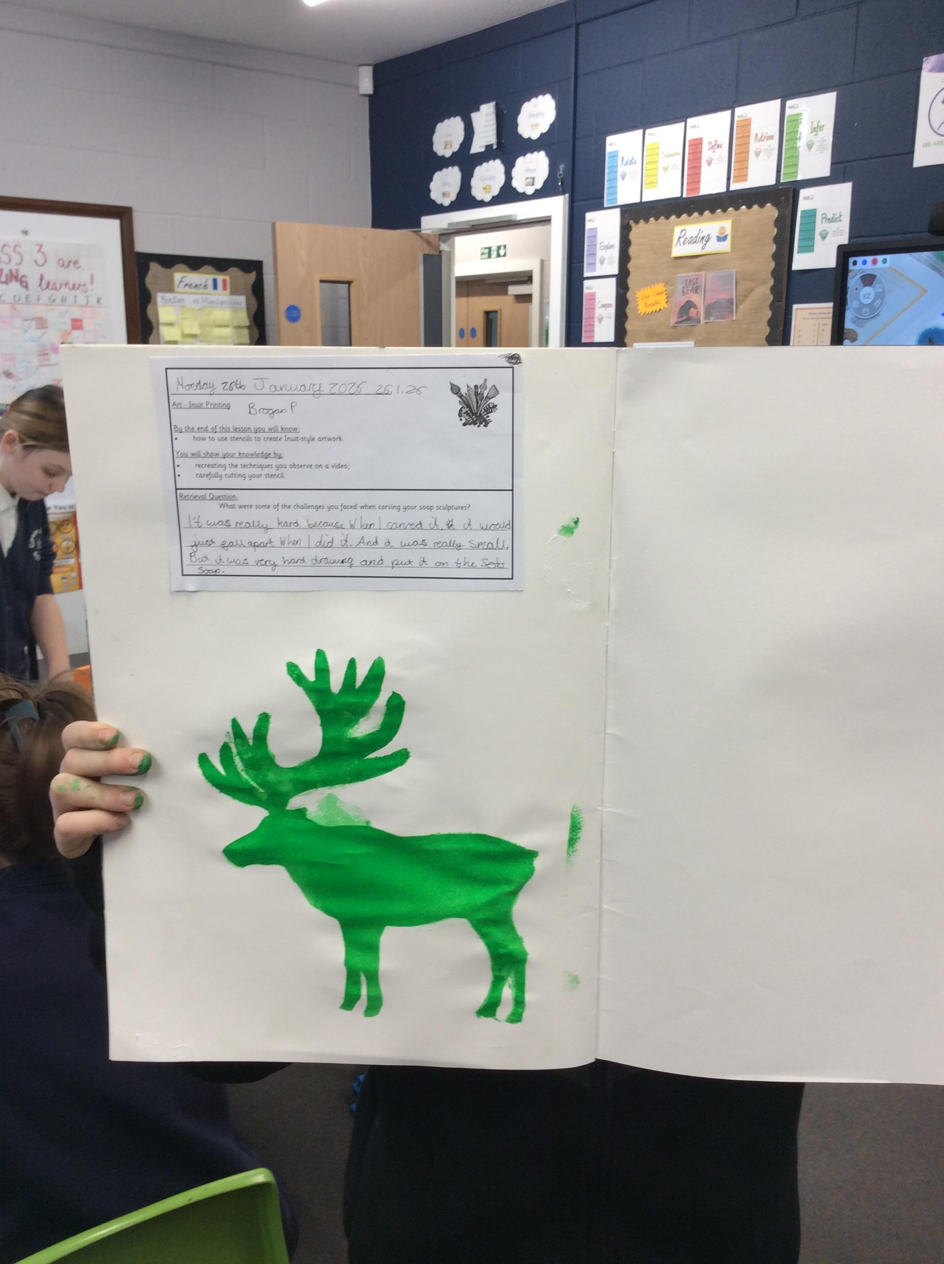 We’ve been exploring stencilling this week! We prepared our stencils by carefully cutting them out. We then taped them into our sketch books, ready to paint in the next session.