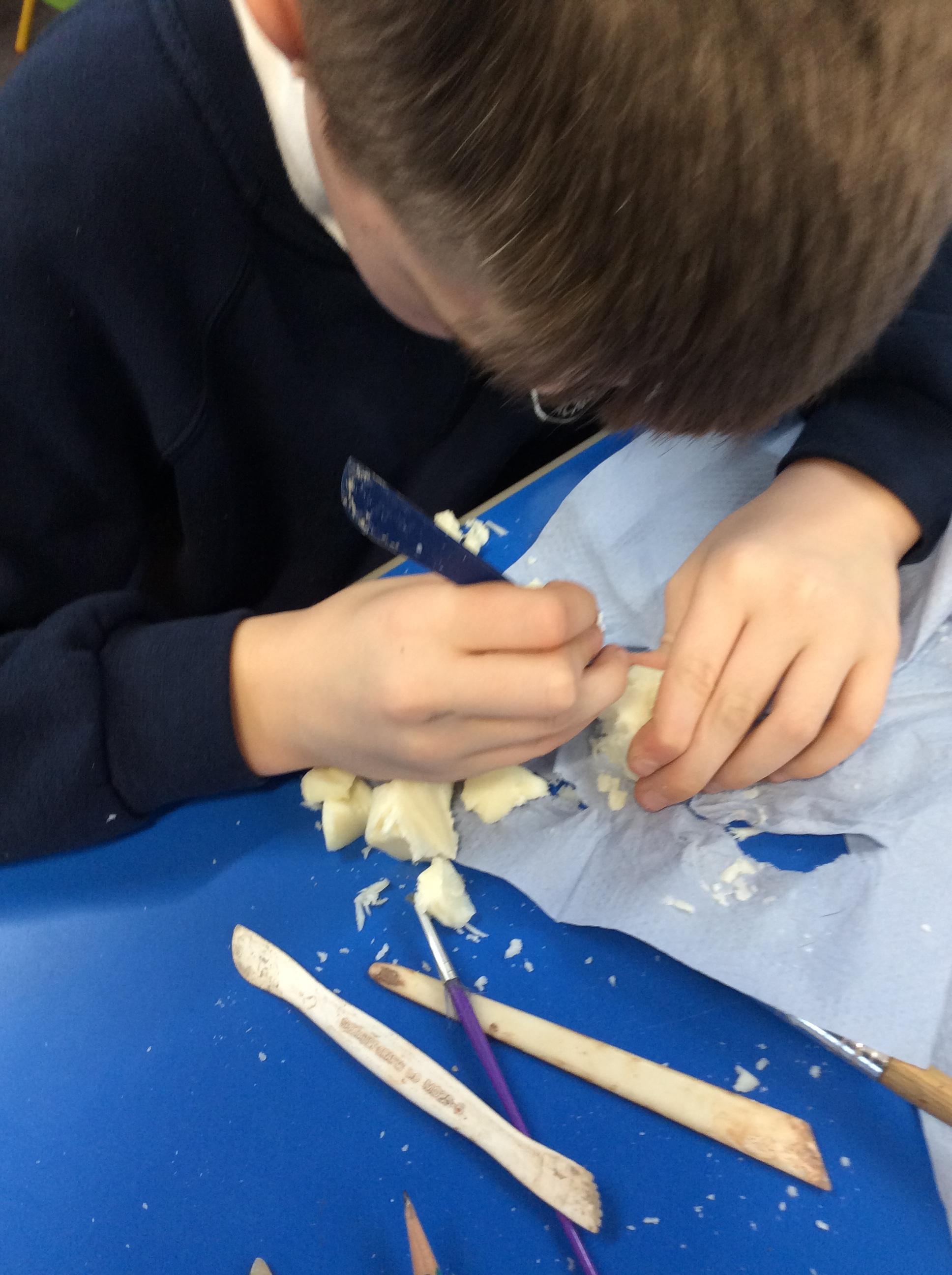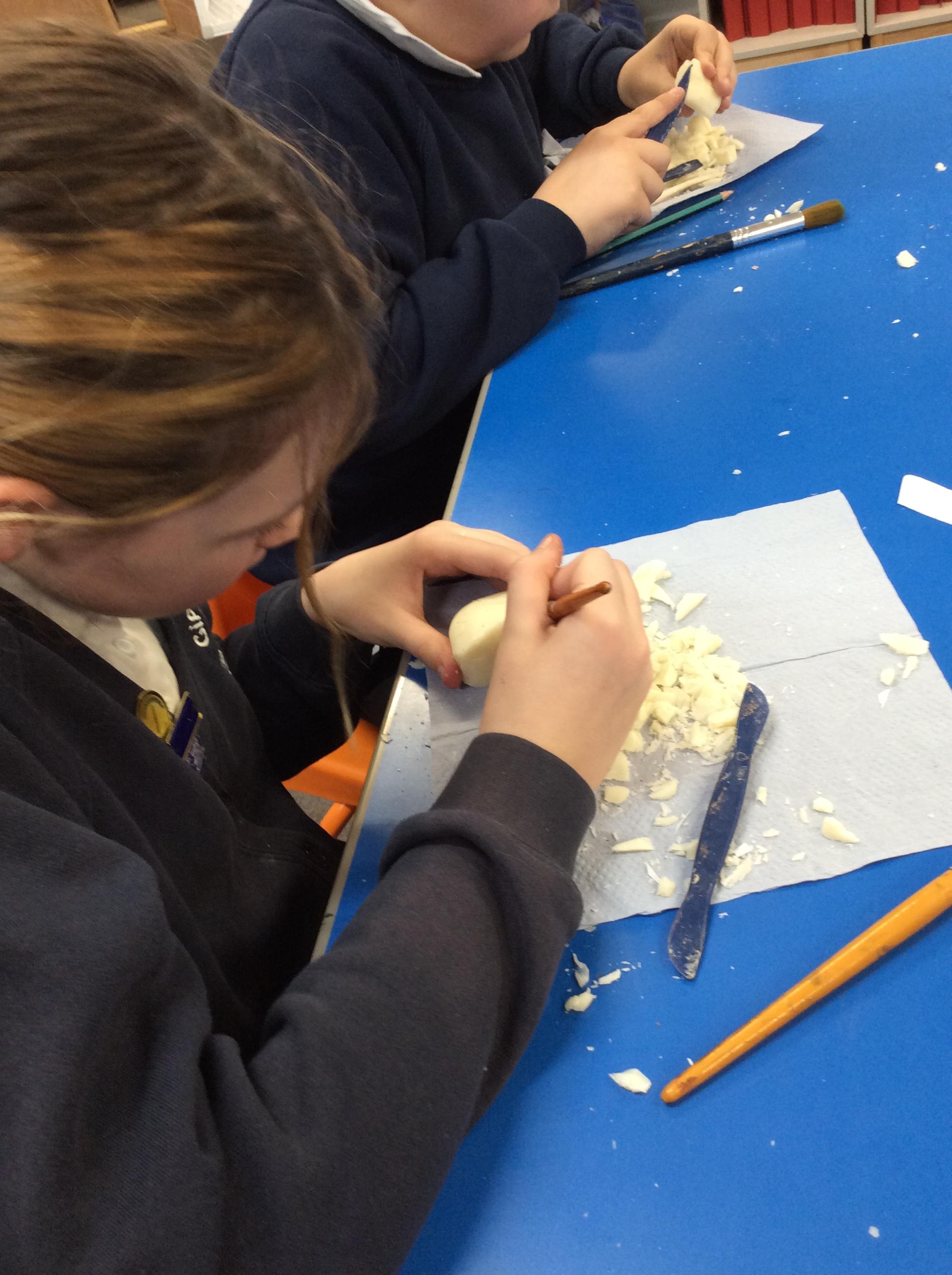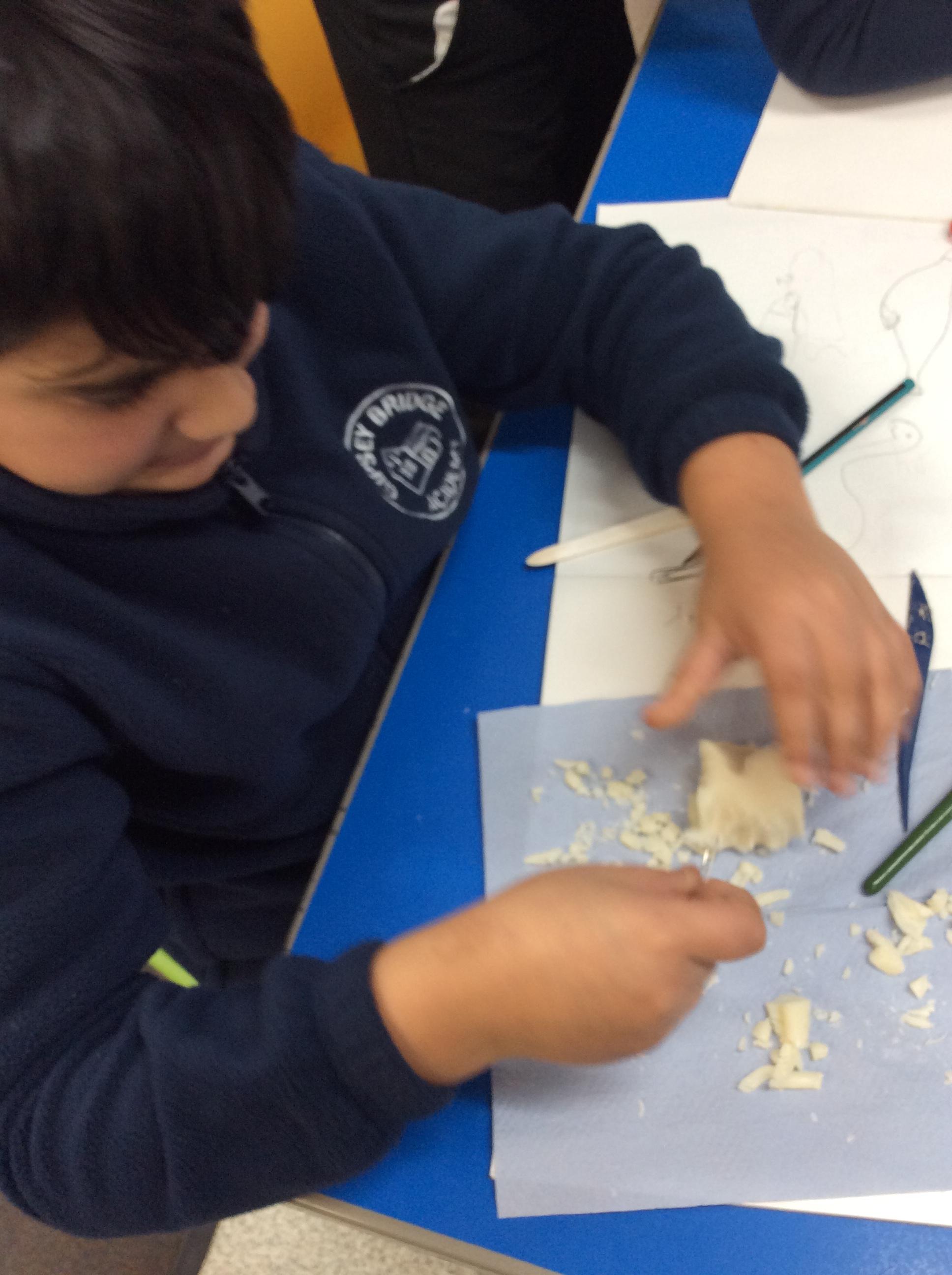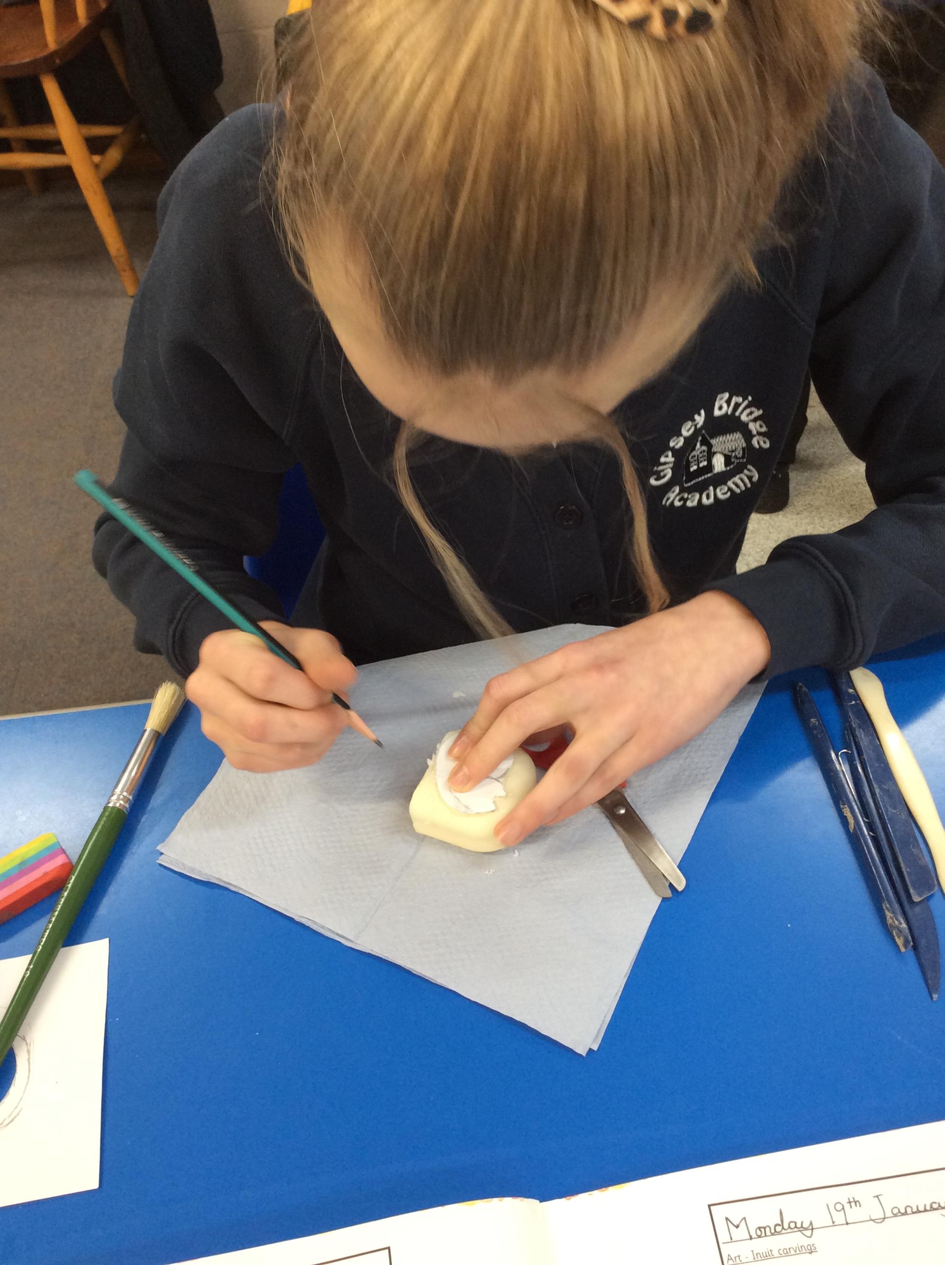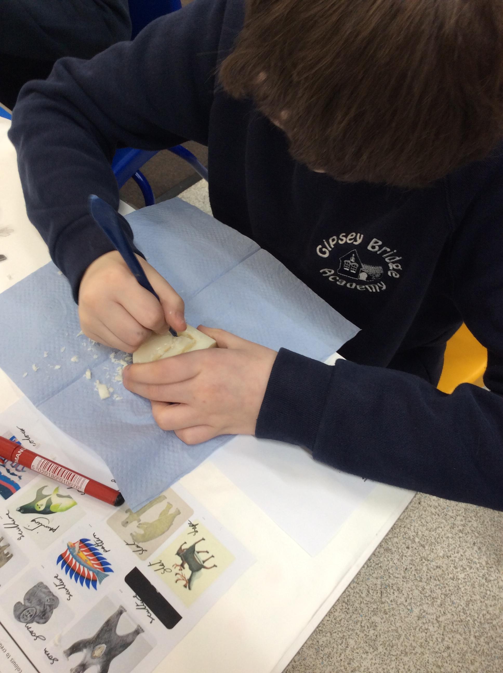 Last week, we researched different Inuit sculptures, thinking about the themes. This week, we put out research into action, using clay tools and bars of soap to create our own sculptures!