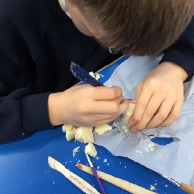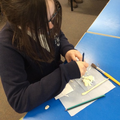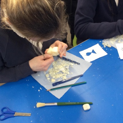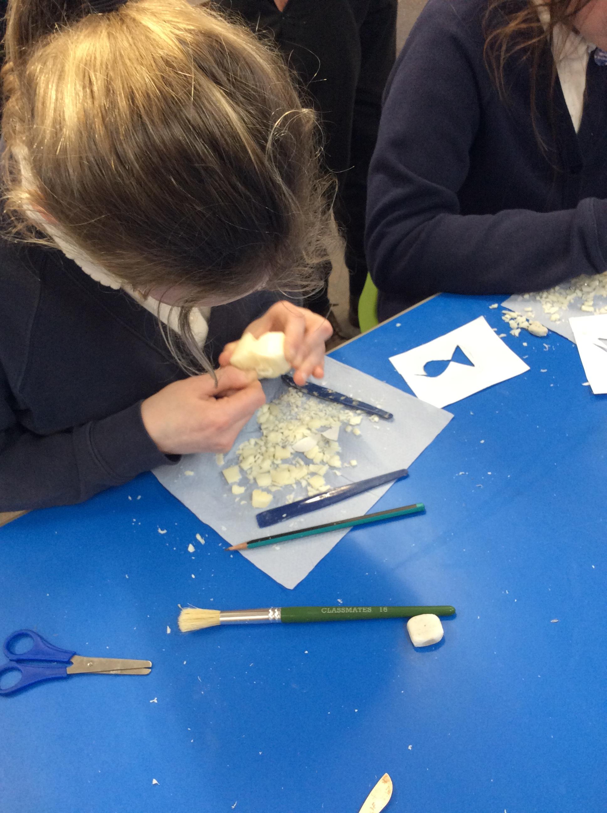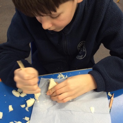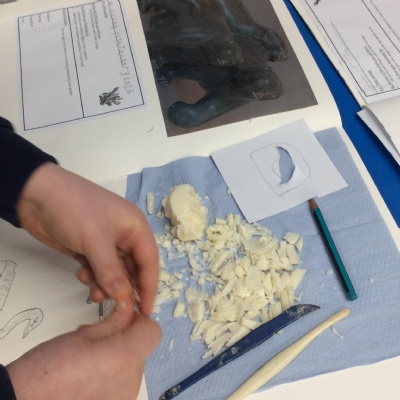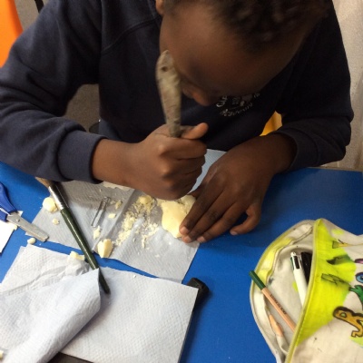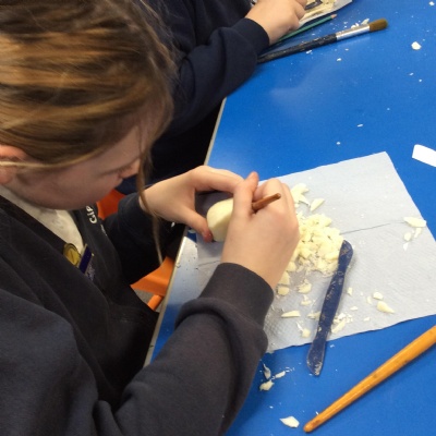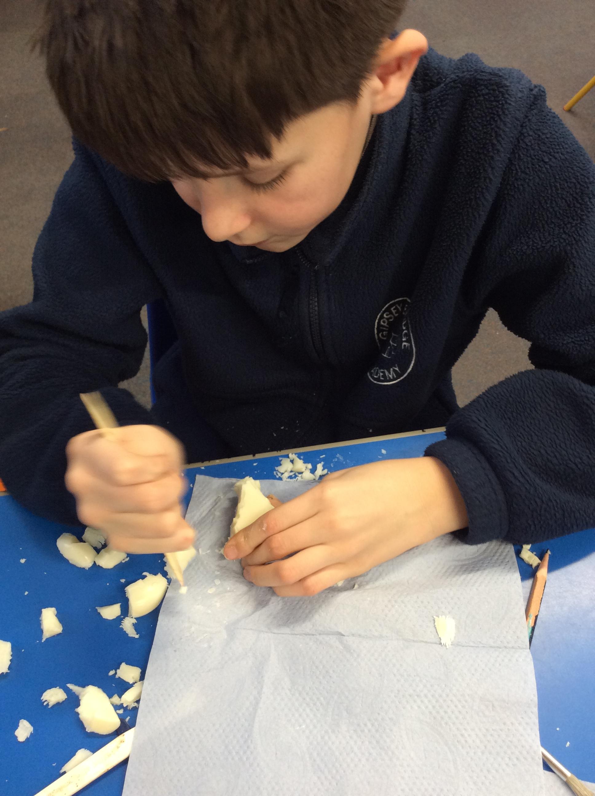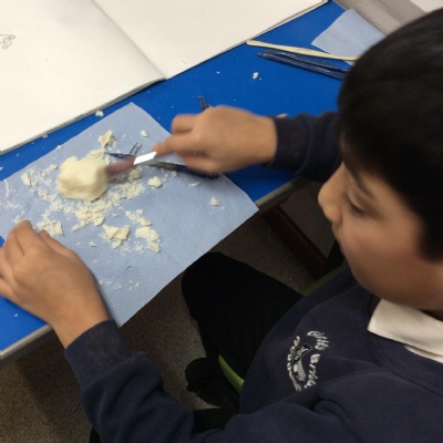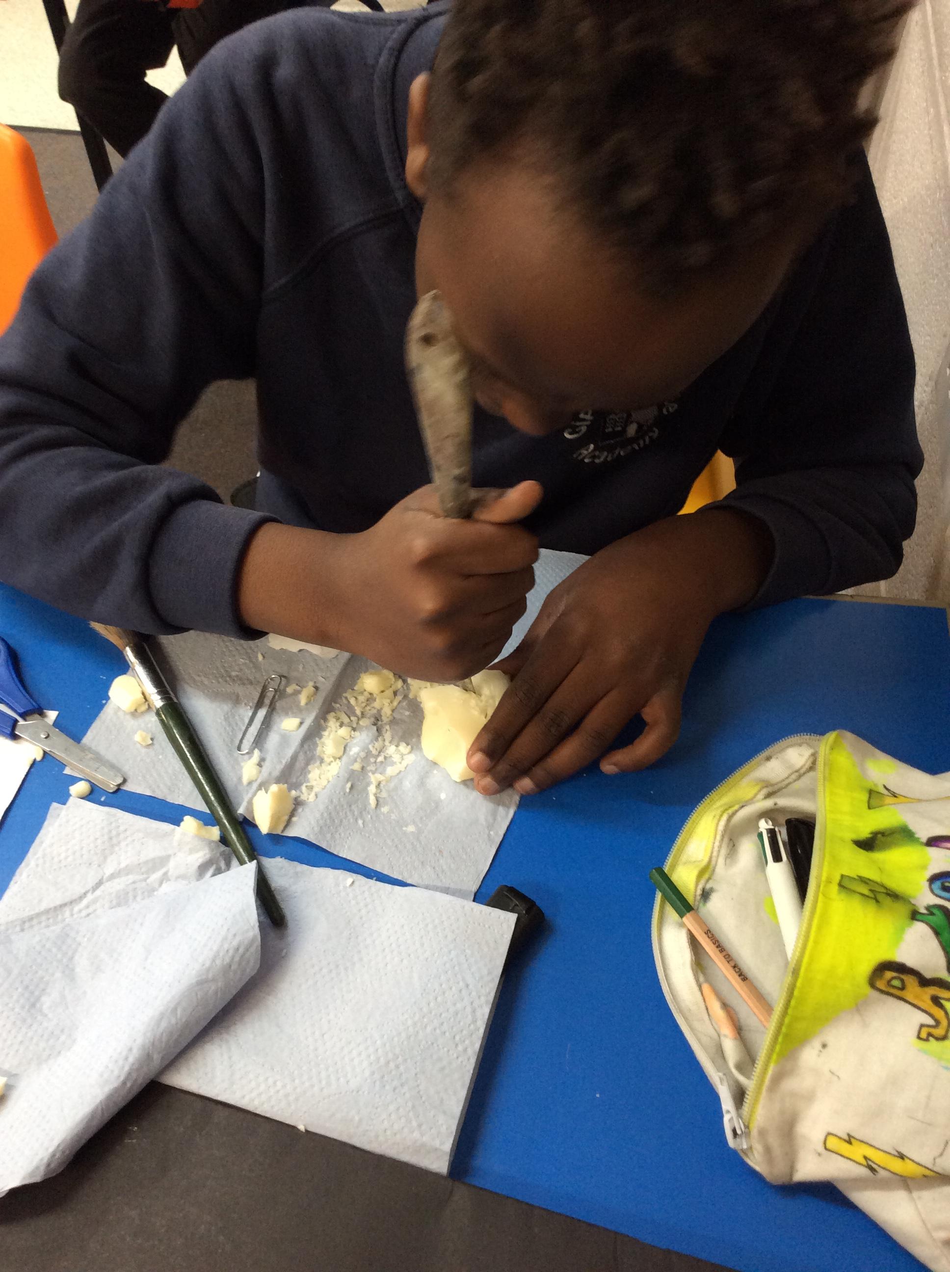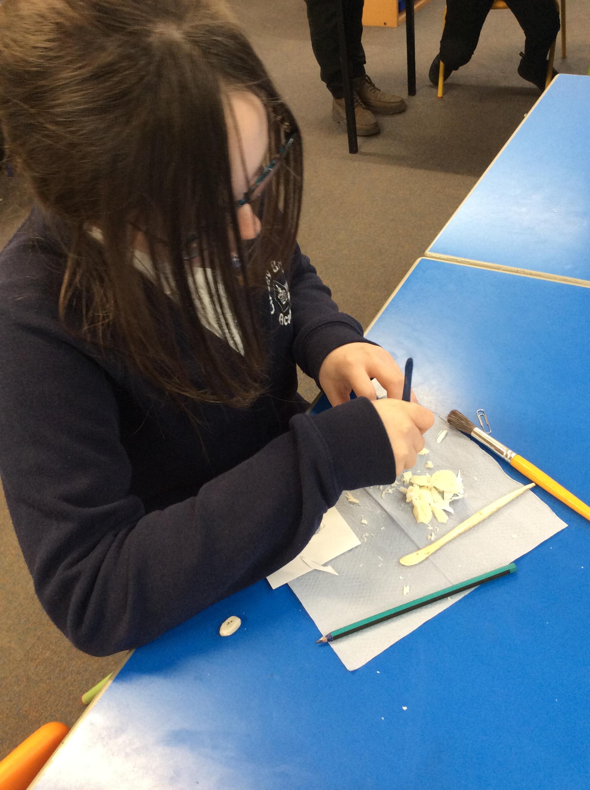 Last week, we researched different Inuit sculptures, thinking about the themes. This week, we put out research into action, using clay tools and bars of soap to create our own sculptures!
